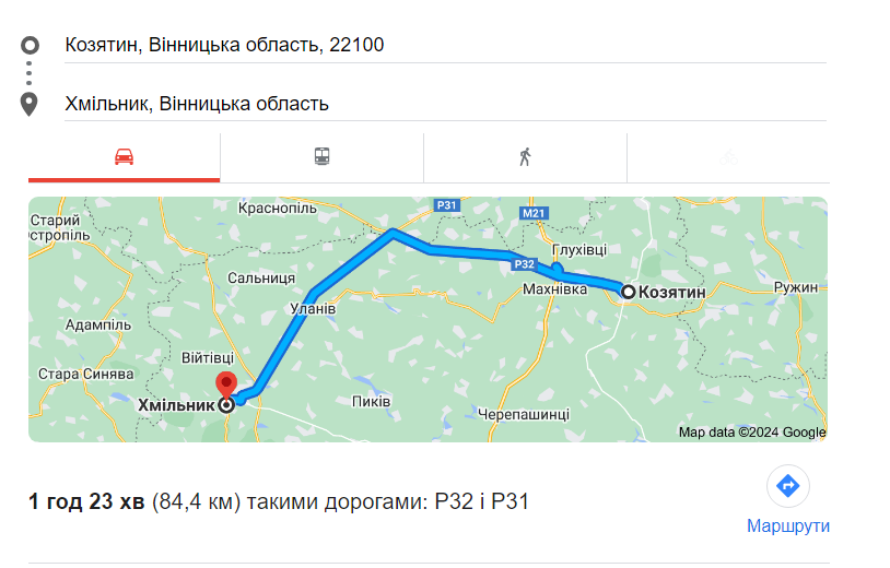 Наші журналісти детальніше промоніторили цю ситуацію і ось що нам вдалося дізнатися. Згідно з гугл-мапою, відстань між містом Козятин та містом Хмільник напряму — 65 км; відстань шляхами — 83 км.