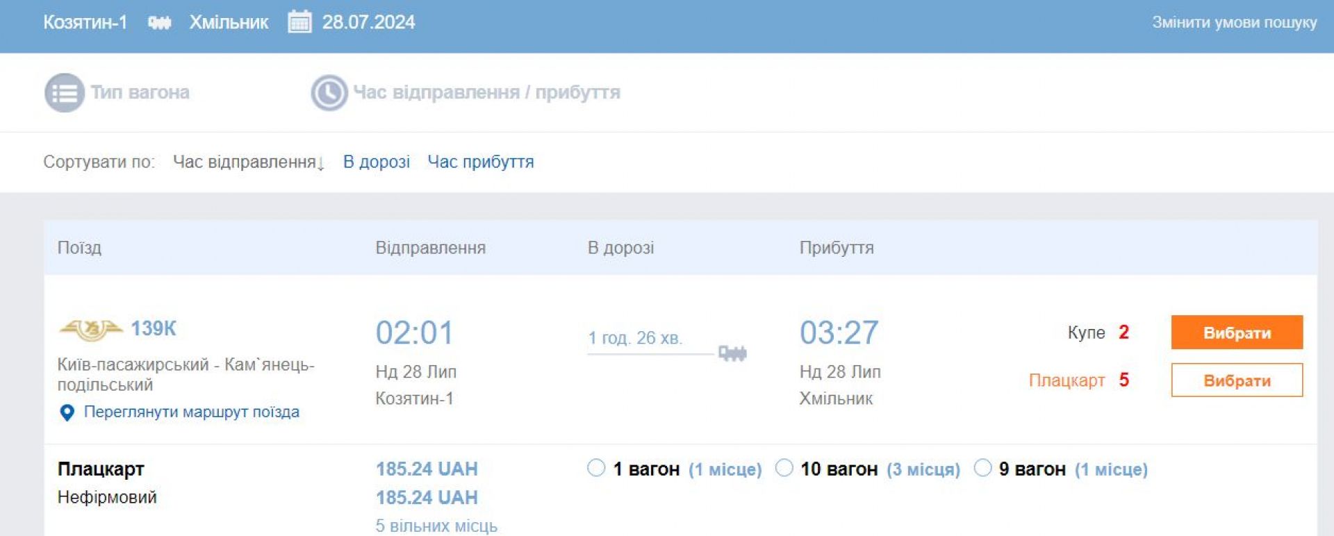 Зазирнули на сайт Укрзалізниці. Вбили у пошук маршрут Козятин-Хмільник. Виявилося, що доїхати від нас до Хмільника можна поїздом Київ — Кам'янець-Подільський. Він курсує раз на день. Відправлення зі станції Козятин-1 о 2.01. У Хмільник він прибуває через півтори години, о 3.27. Та навіть якщо заїхати у Хмільник поїздом, як дістатися назад? Пішки? За розкладом поїзд Кам’янець-Подільський — Київ відправляється з Хмільника о 1.24 і прибуває до Козятина о 2.50.