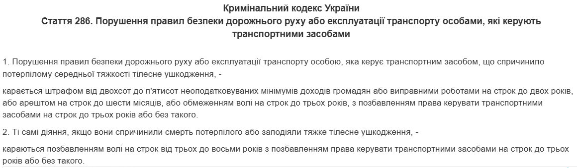 — Пасажир авто (також поліцейський) отримав тілесні ушкодження. За вказаним фактом розслідується кримінальне провадження за ч. 1 ст. 286 ККУ, — додає Заріна.