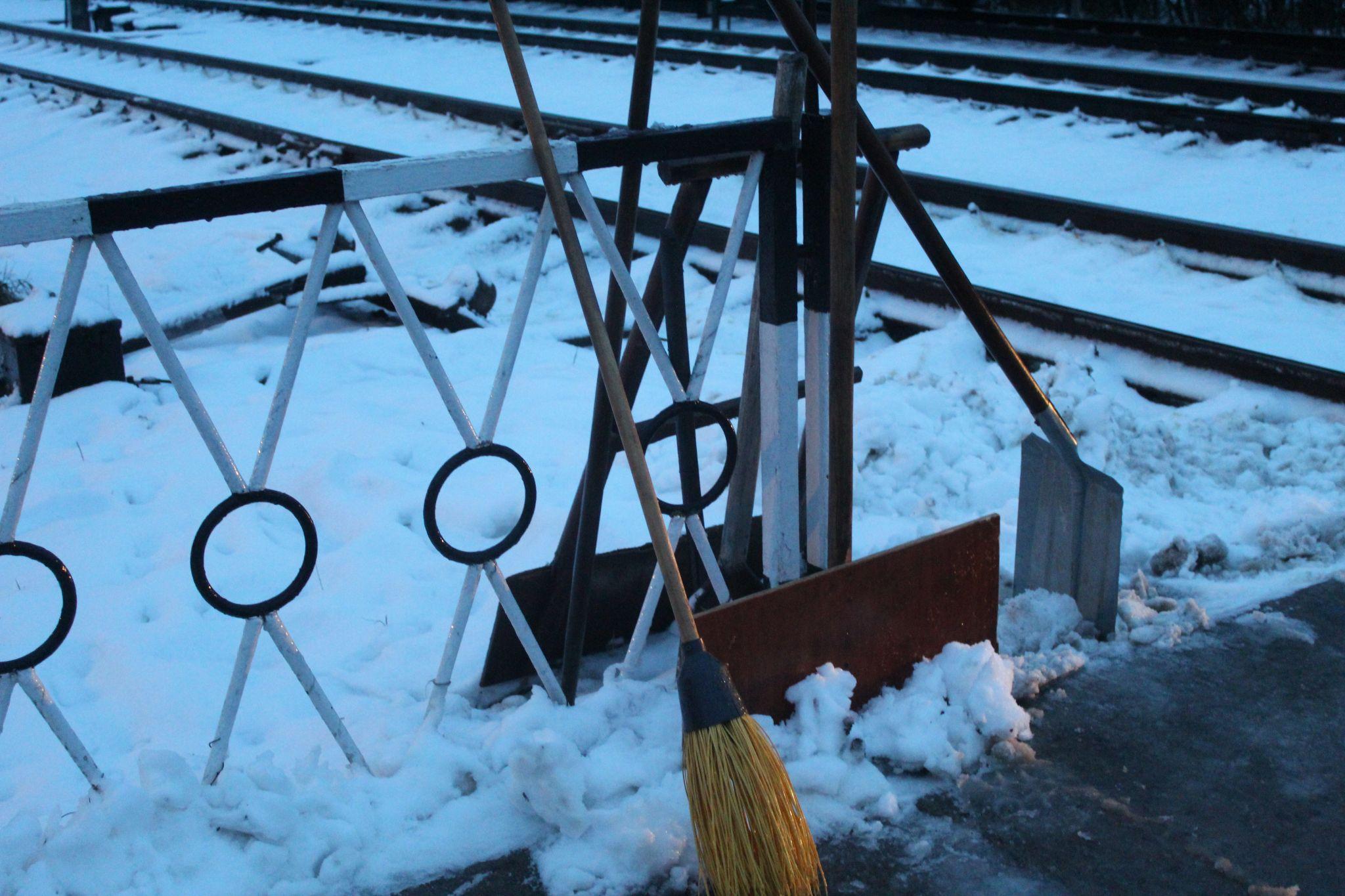— Це всі мої, — з посмішкою відповідає залізничниця, — Коли тільки почався сніг, можна було працювати самою великою. За ніч перепробувала всі. Від дощу сніг так намок, що прибирати його під силу малою лопатою.