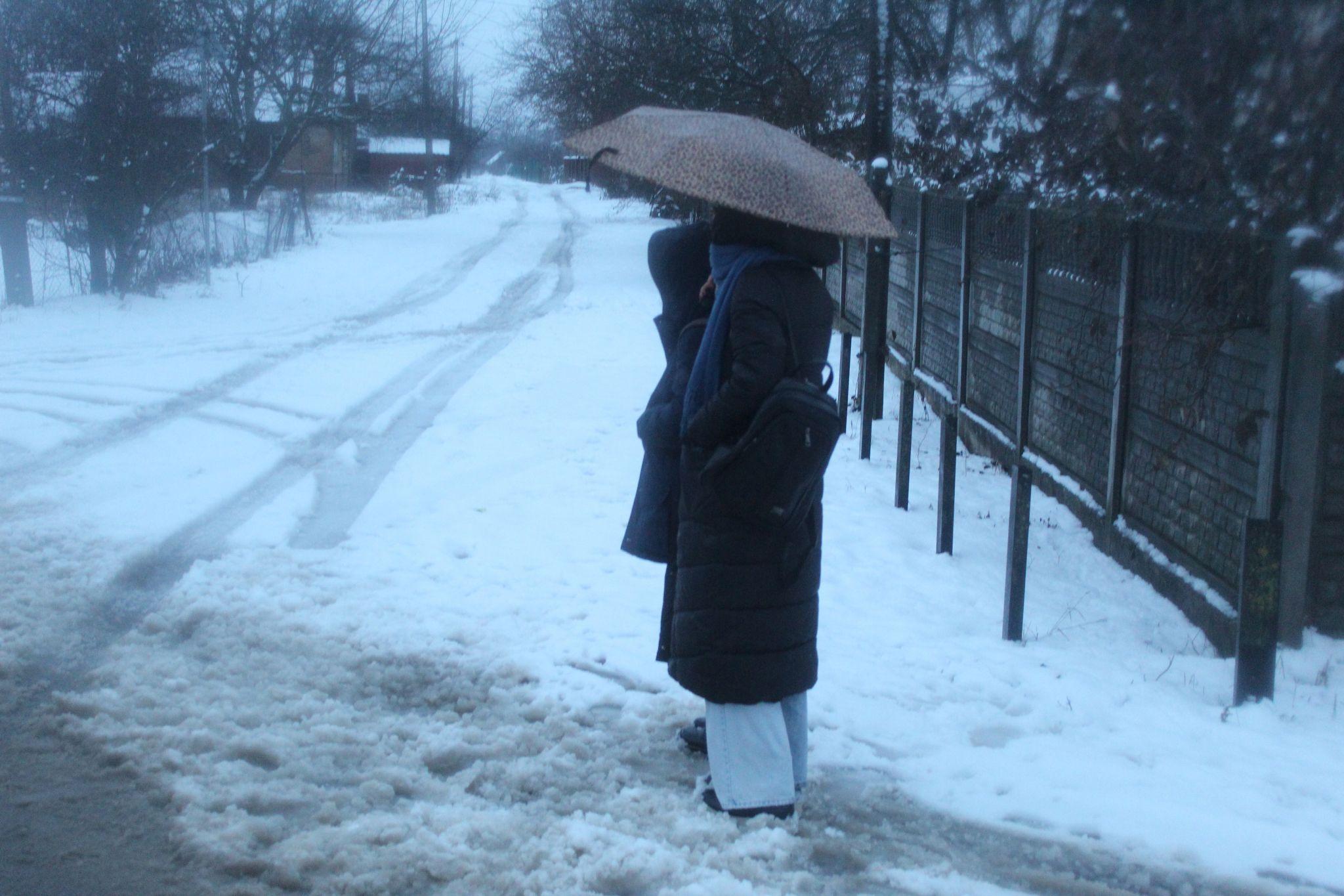 Ліцеїстці Поліні сніговий колапс навіть у цікавинку. Вона своїми водостійкими чобітками в сніговій каші пробує протоптати доріжку до зупинки маршрутки.