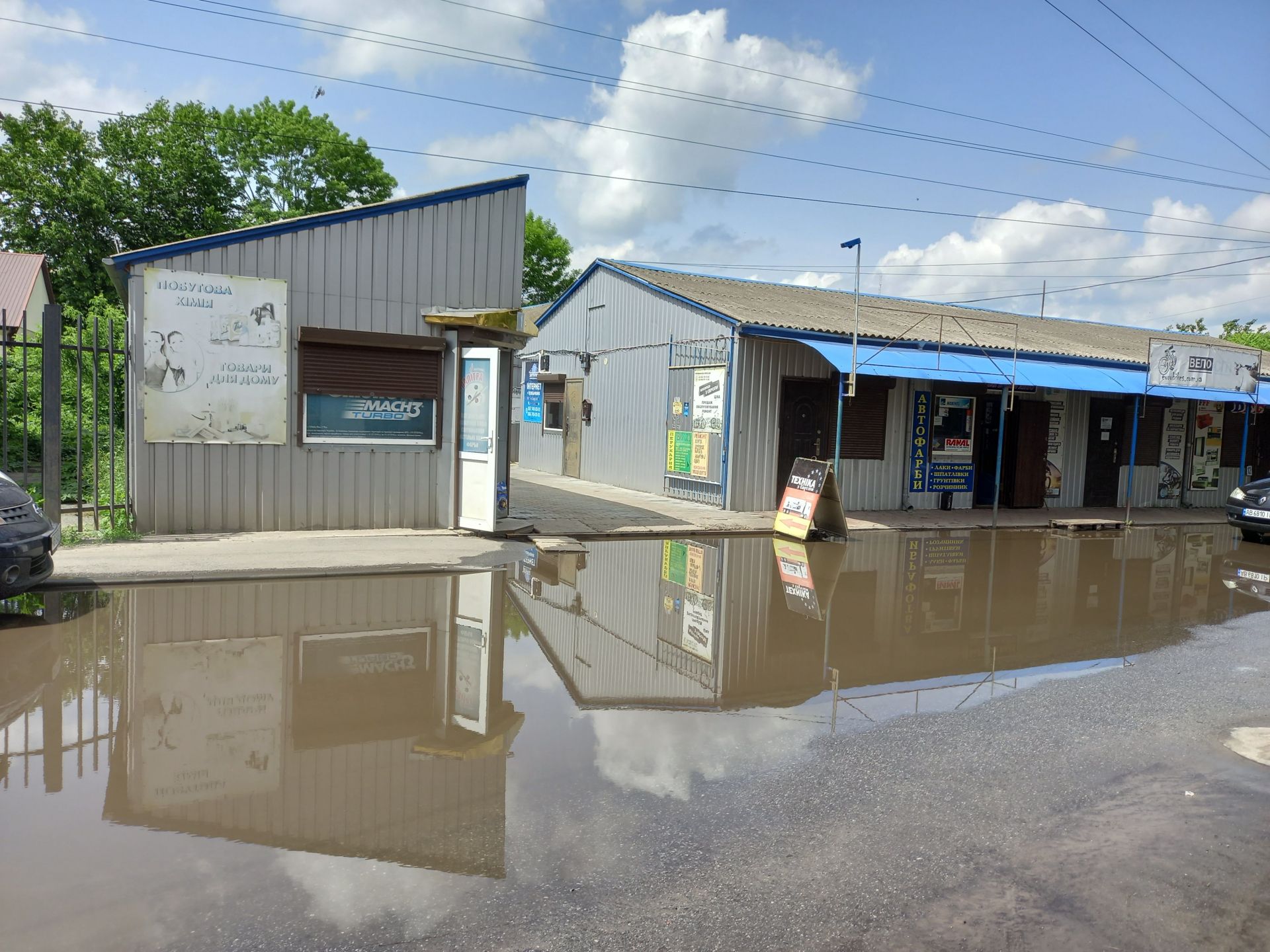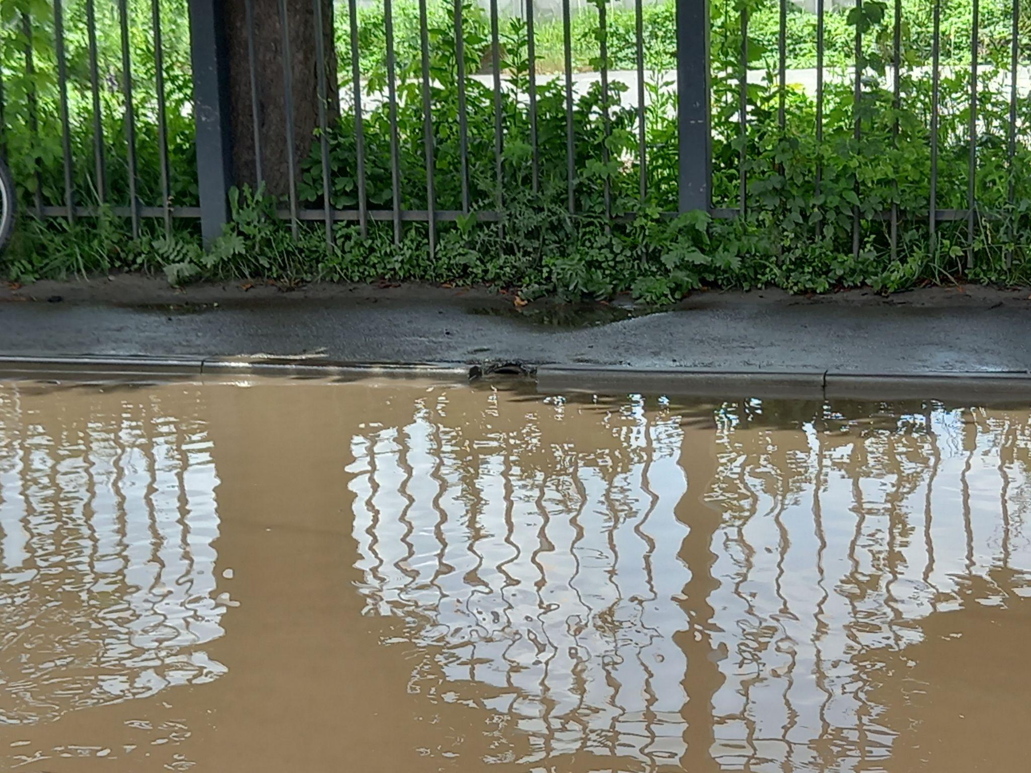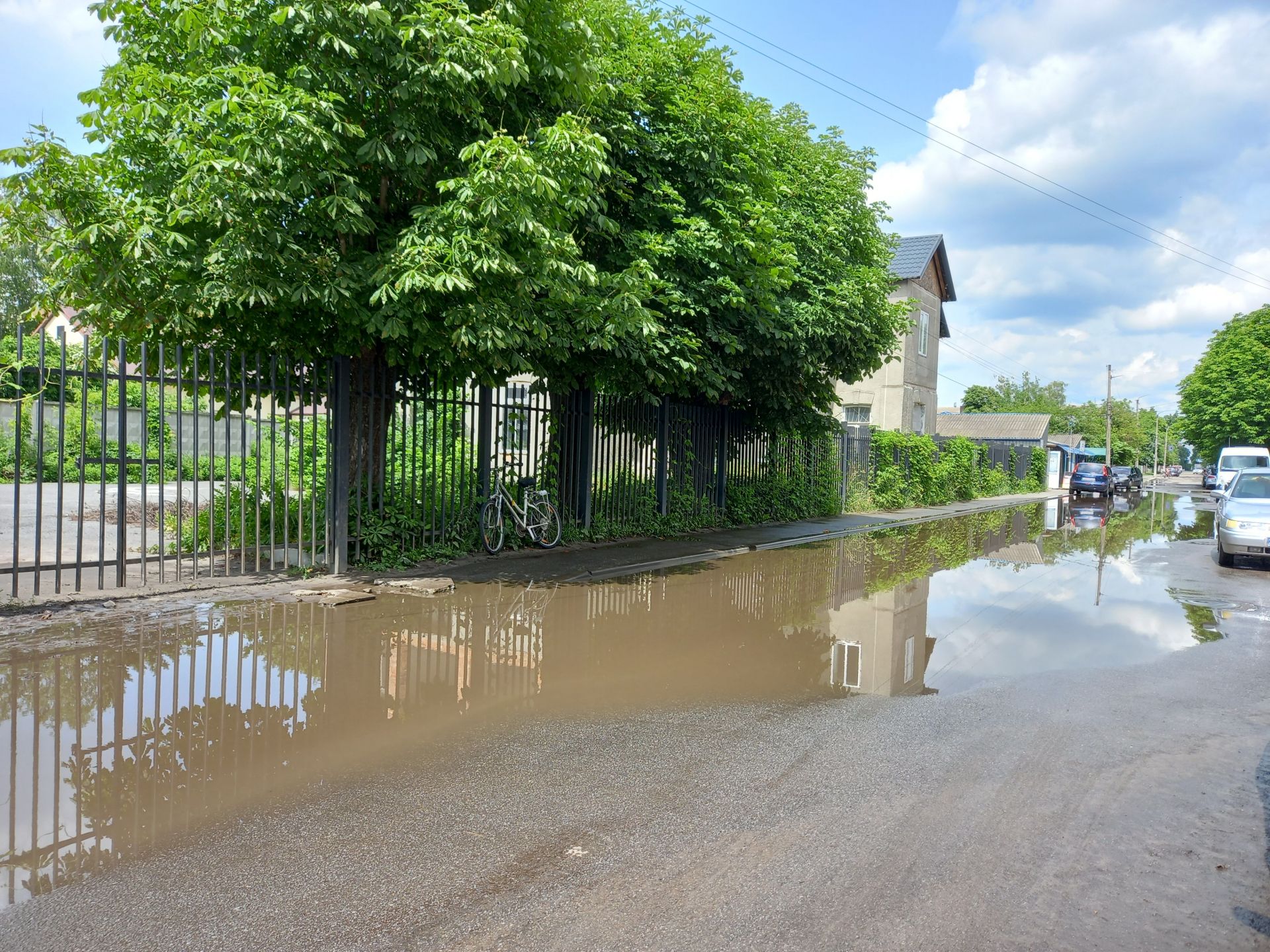 Понеділок, 10 червня. Останні дві доби дощ не йшов. За вікном спека — типова ситуація для червня. Тож суботні калюжі мали б вже давно випаруватися. Йдемо на вулицю Винниченка, але застаємо ту саму картину, яку описувала наша читачка, коли телефонувала нам після зливи у суботу. Навпроти «Екрану» та ринку дві глибочезні калабані на все дорожнє полотно. Повз нас проїжджає чоловік на велосипеді і їде прямісінько через калюжу. Водії, які залиши свій транспорт на узбіччі, примудрилися ще й якось припаркуватися у воді та вийти з машини.