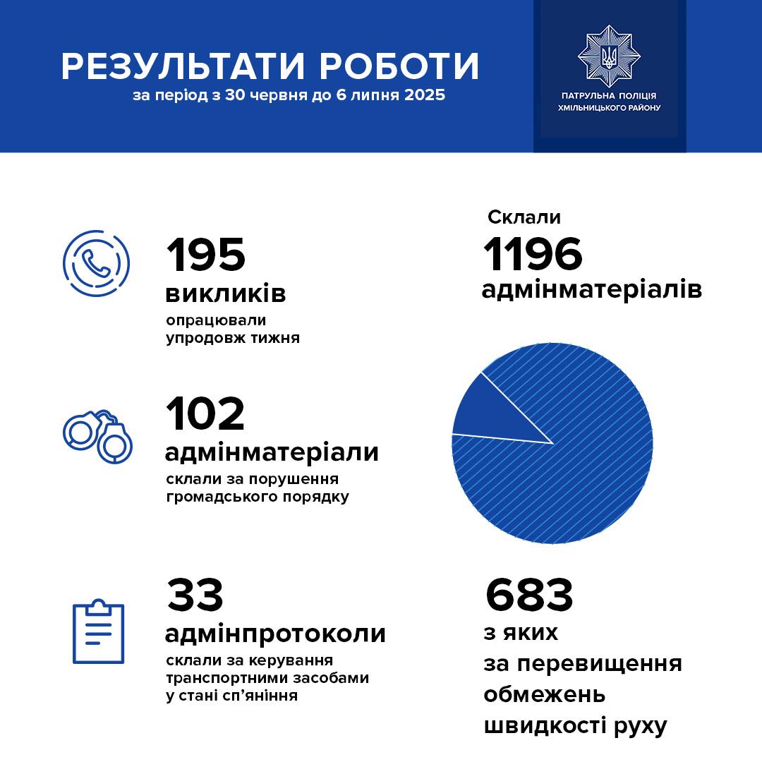 За минулий тиждень поліцейські опрацювали 195 викликів, виявили 33 водія з ознаками сп'яніння, винесли 1196 постанов, з яких 683 за перевищення швидкості руху.