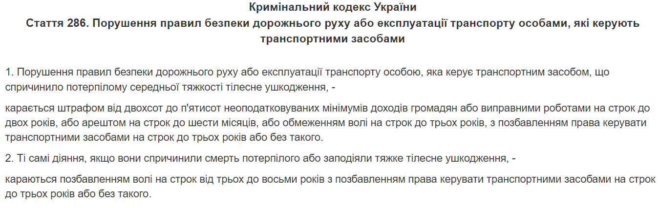 За даним фактом правоохоронці відкрили кримінальне провадження за статтею 286, частина 2. Після всіх відповідних експертиз та після встановлення ступеню тяжкості тілесних ушкоджень, буде вирішуватись міра покарання.