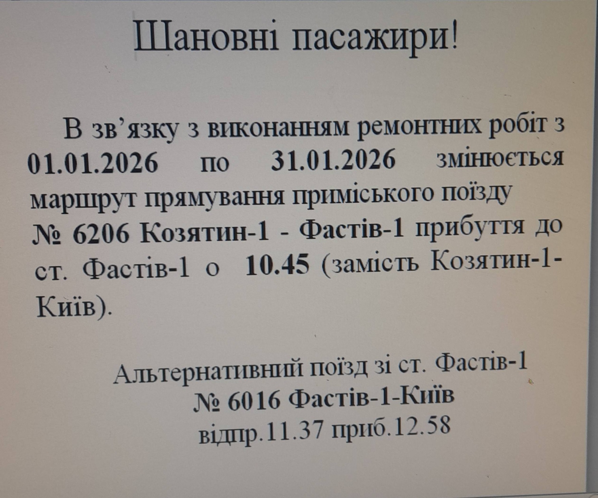 Як йдеться у повідомленні, у зв'язку з виконанням ремонтних робіт, з 1 по 31 січня 2026 року змінюється маршрут прямування електрички №6206 Козятин-1- Фастів — прибуття до станції Фастів-1 о 10:45 (замість «Козятин-1 — Київ»).