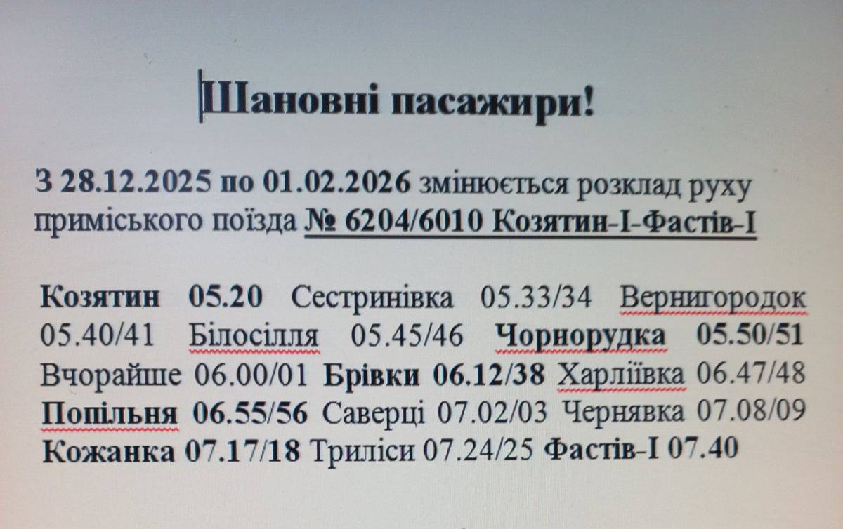 Також варто знати, що з 28 грудня по 1 лютого 2026 року змінюється розклад руху приміського поїзда №6204-6010 «Козятин-1- Фастів-1