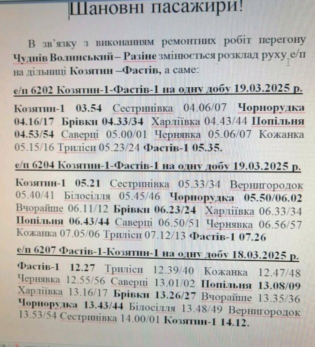 - У зв'язку з виконанням ремонтних робіт перегону Чуднів-Волинський-Разіне змінюється розклад руху електропоїздів на дільниці Козятин-Фастів на одну добу 18-19 березня