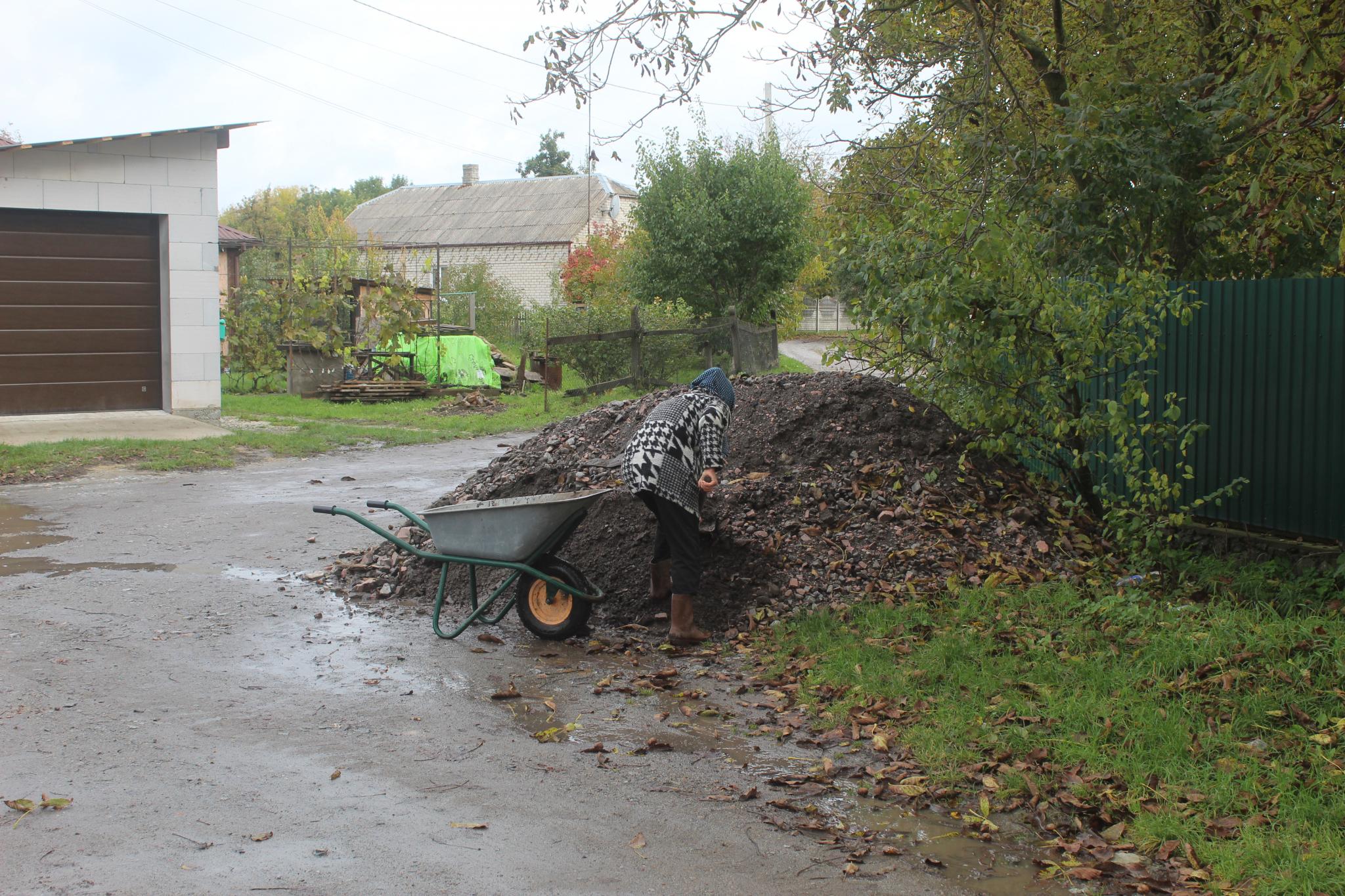 До роботи взялися і жителі вулиці. Жінка пенсійного віку мала калюжу біля самісіньких воріт і 5 тачок завезла в калюжу самотужки. Молодші жінки просили її щоб берегла здоров’я та розповіли, що Григорівна за фахом медик і по цей день сусідів лікує, тож її здоров’я точно треба берегти.