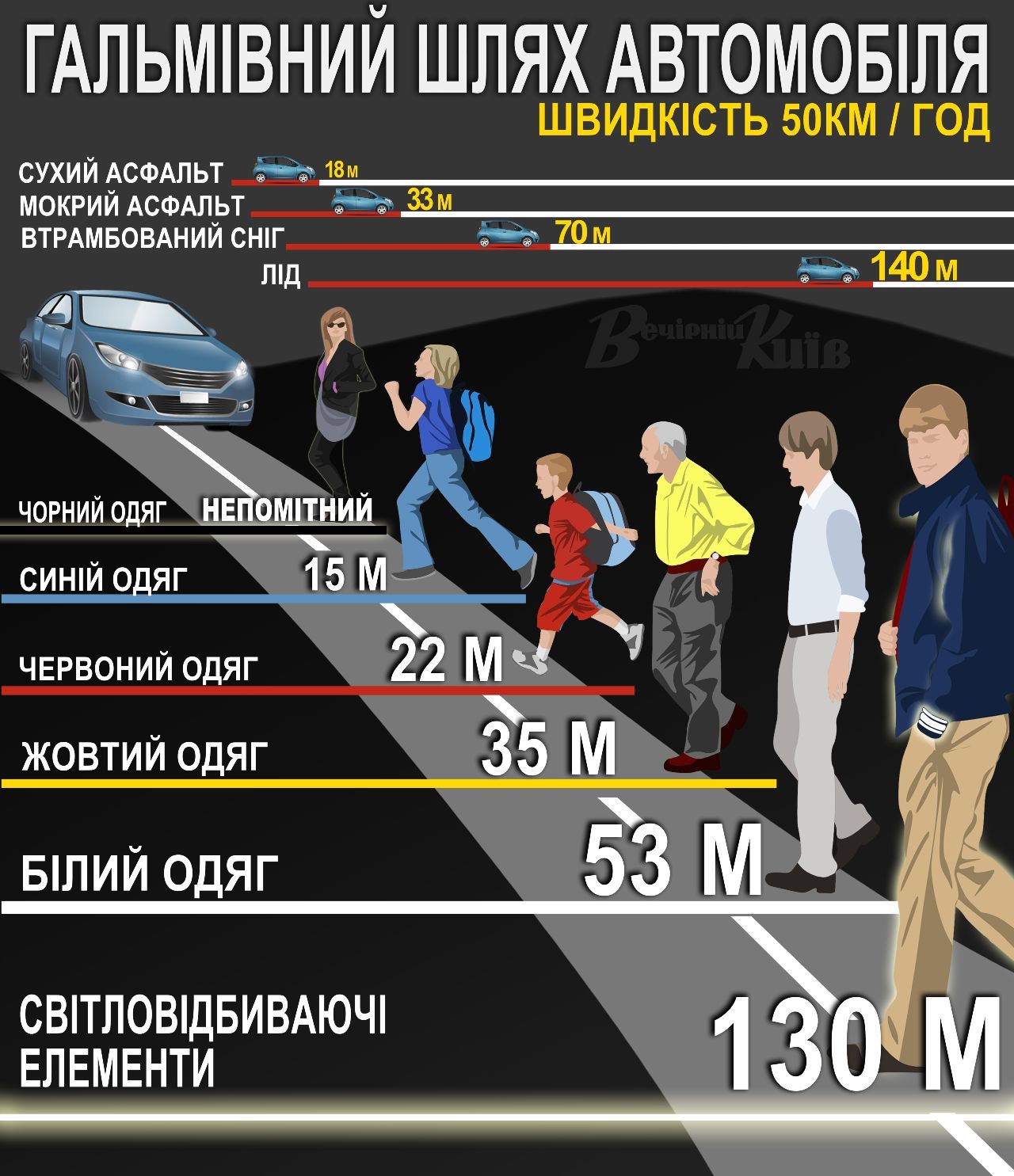 Відстань, з якої водій помічає пішохода у темряві, одягнутого у темне, складає 20 метрів, 50 — якщо людина вбрана у світле, і 130 — якщо на його одязі наявні світловідбивні елементи.