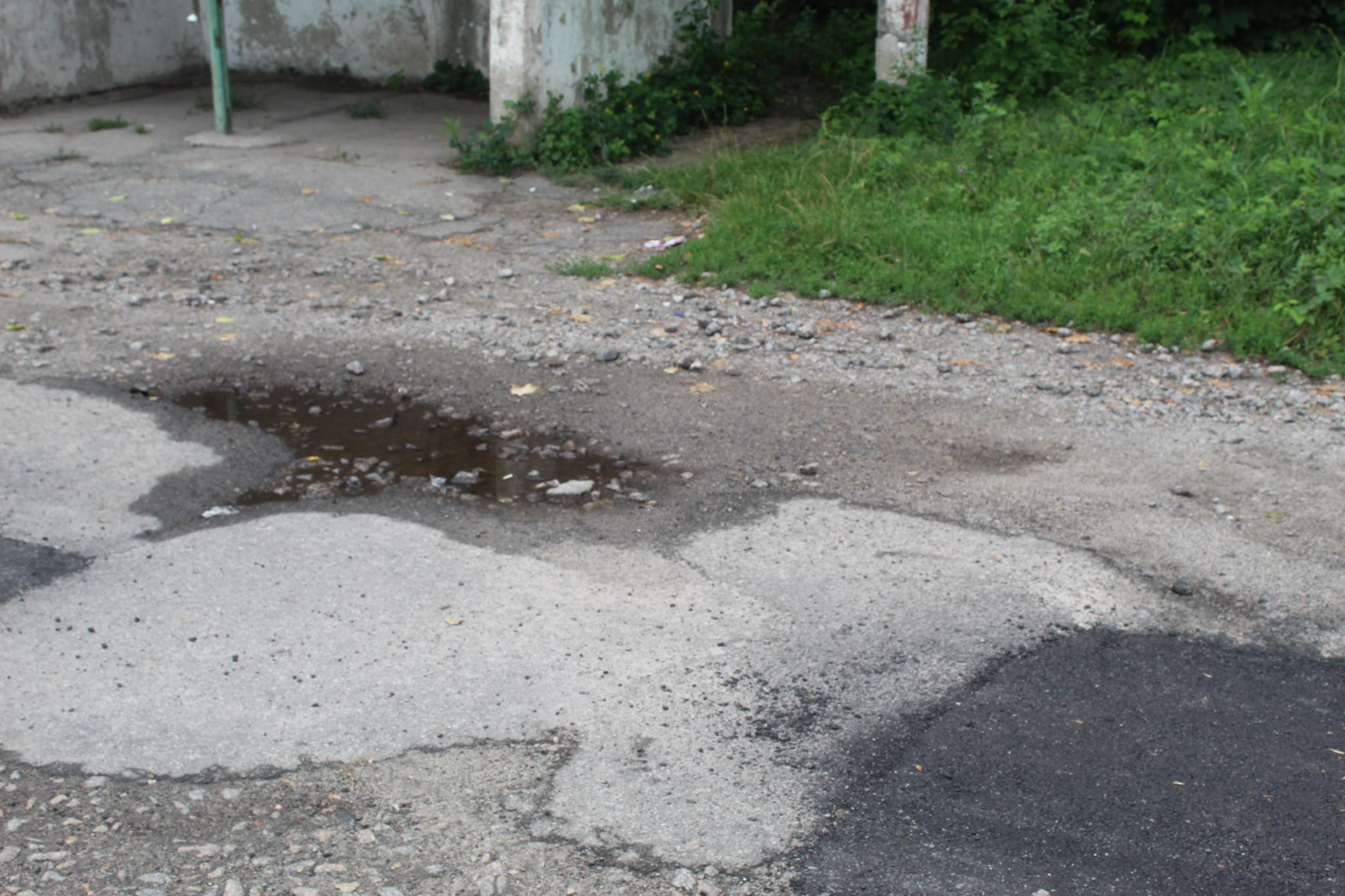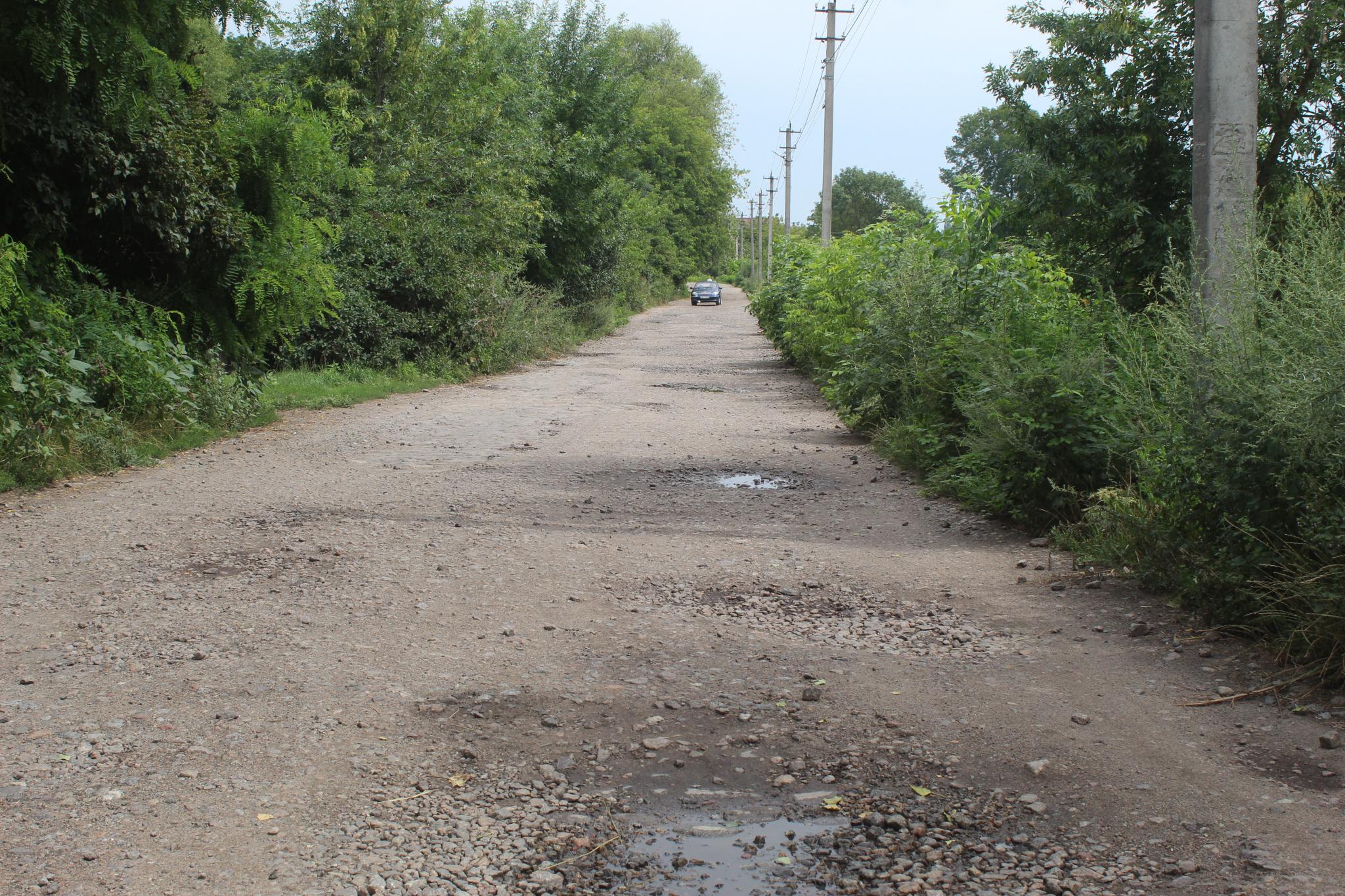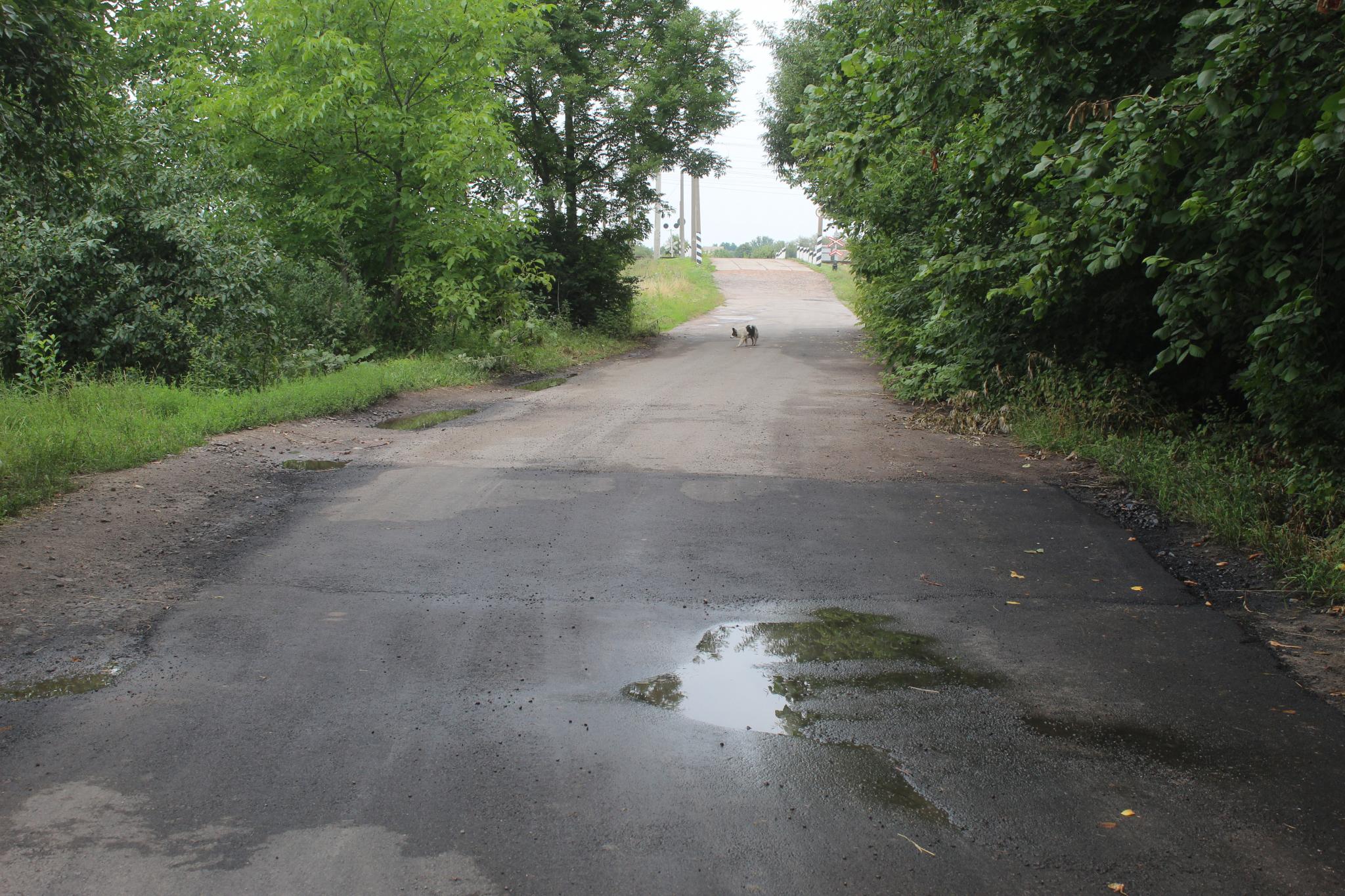 Перед переїздом — велика латка з свіжовкладеного асфальту. В середині того асфальтового покриття невеличка калюжа з водою. За переїздом — велика яма, яку не помітити було складно, але дорожники її з якоїсь причини обійшли і почали закладати ями ближче до села.