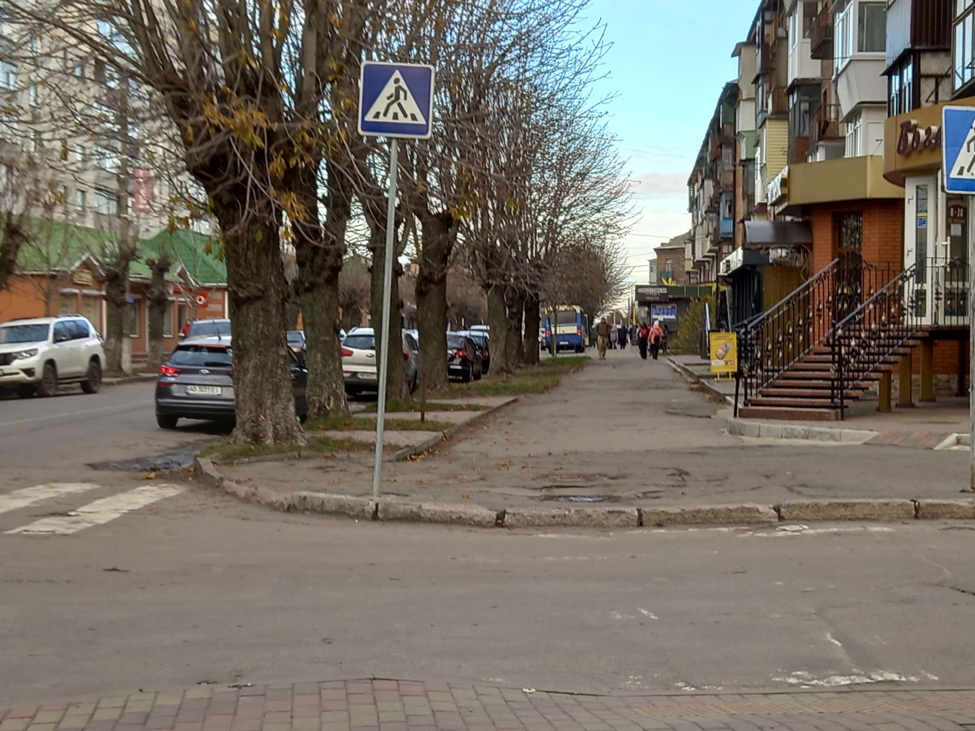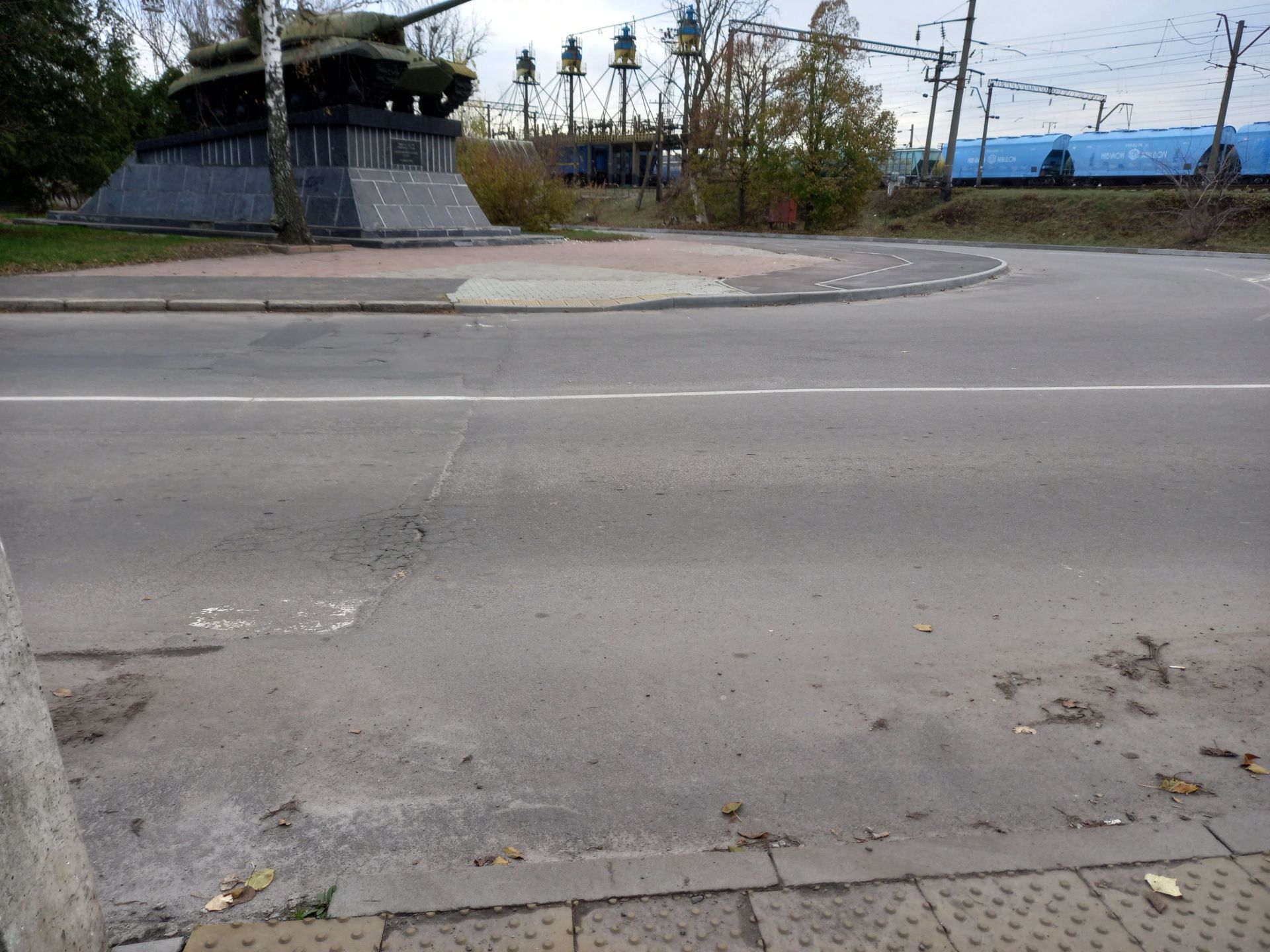 Після того, як Тетяна написала нам в Інстаграмі, ми зробили коло центральними вулицями міста. Почали нашу прогулянку від танка, що на перетині Незалежності та Куликівського. На останній, нагадаємо, не так давно робили капітальний ремонт — лагодили і проїжджу частину, і тротуар. Перед заходом на пішохідну доріжку висоту бортових каменів знизили, але бордюр все одно на кілька сантиметрів виступає над дорожнім полотном.