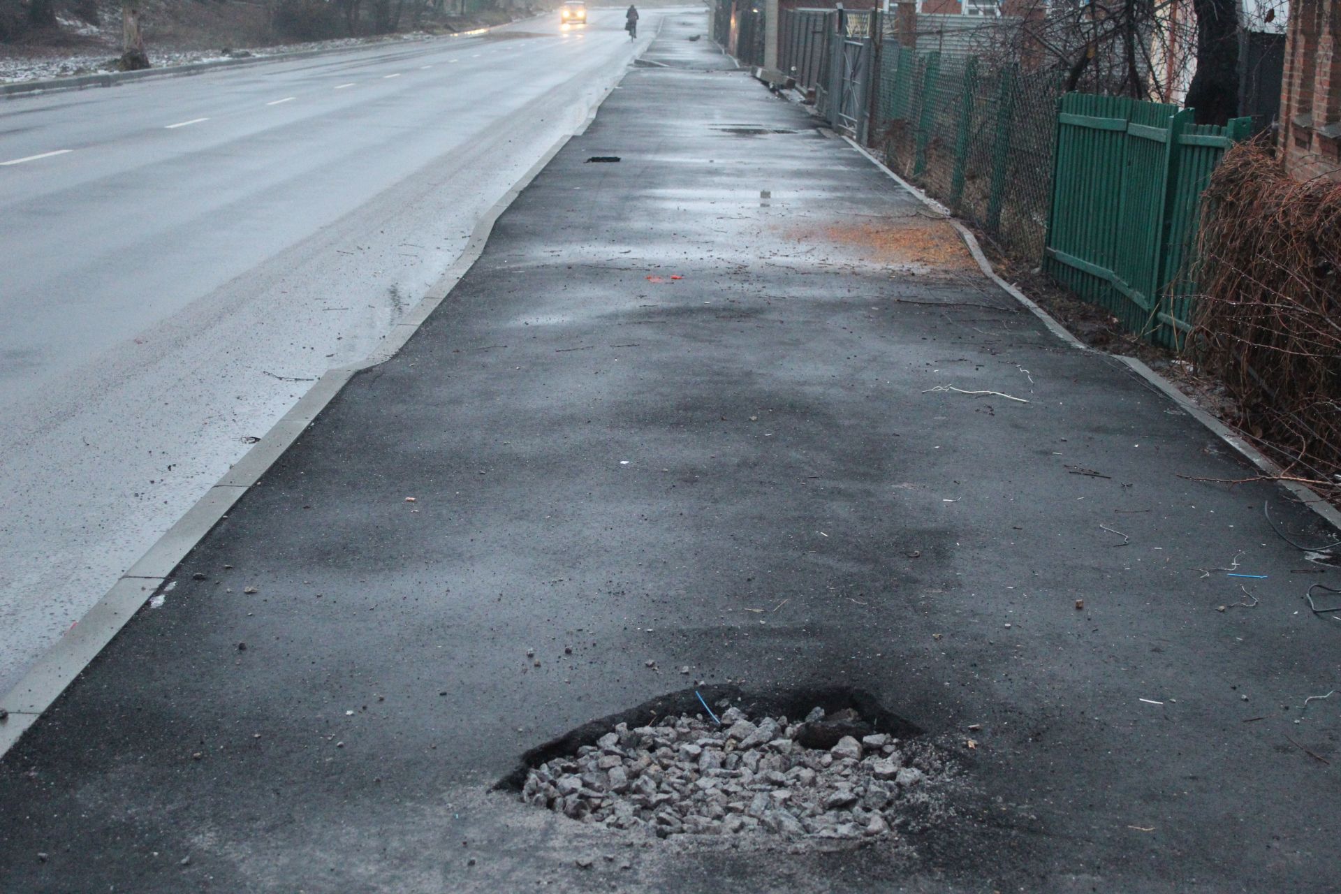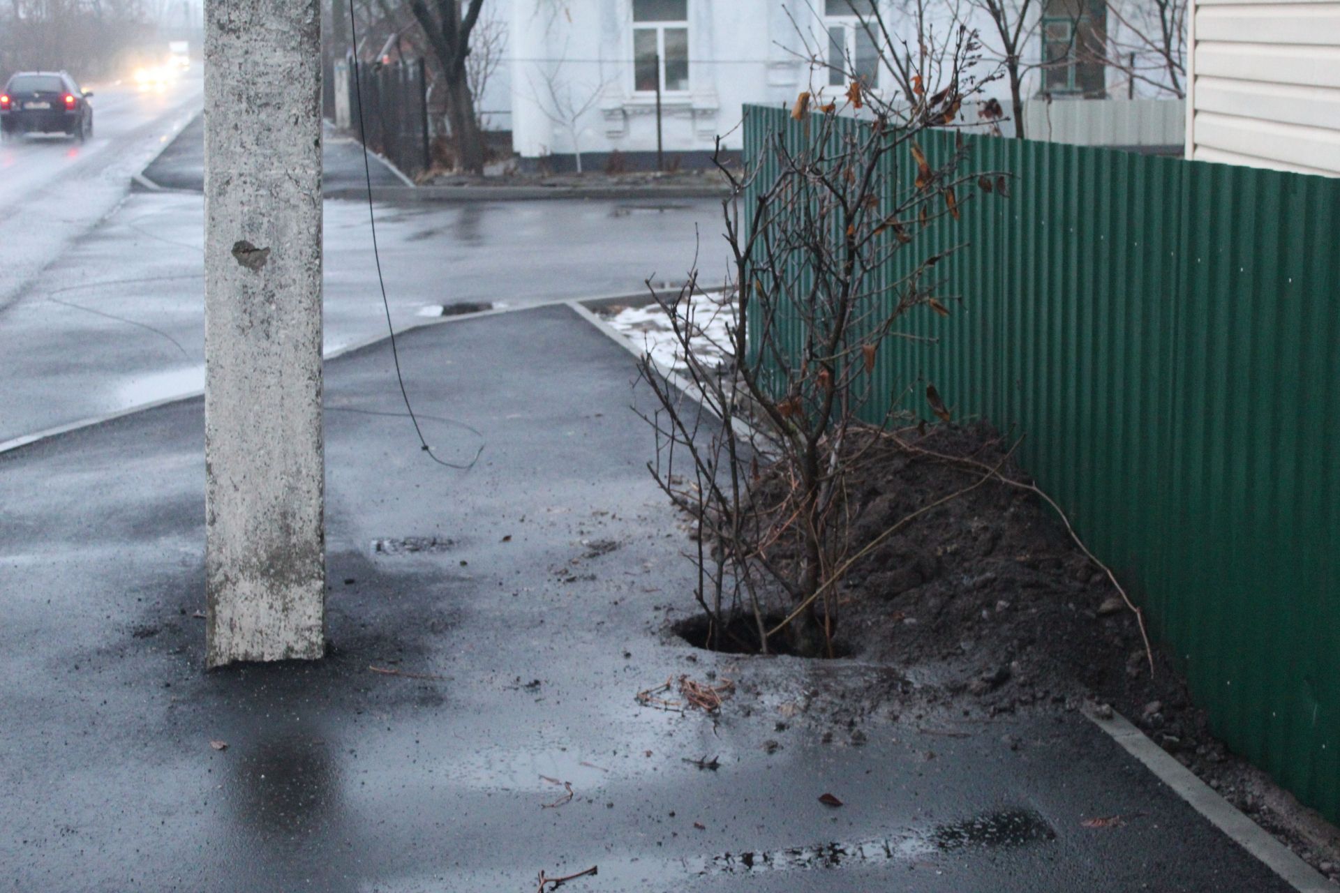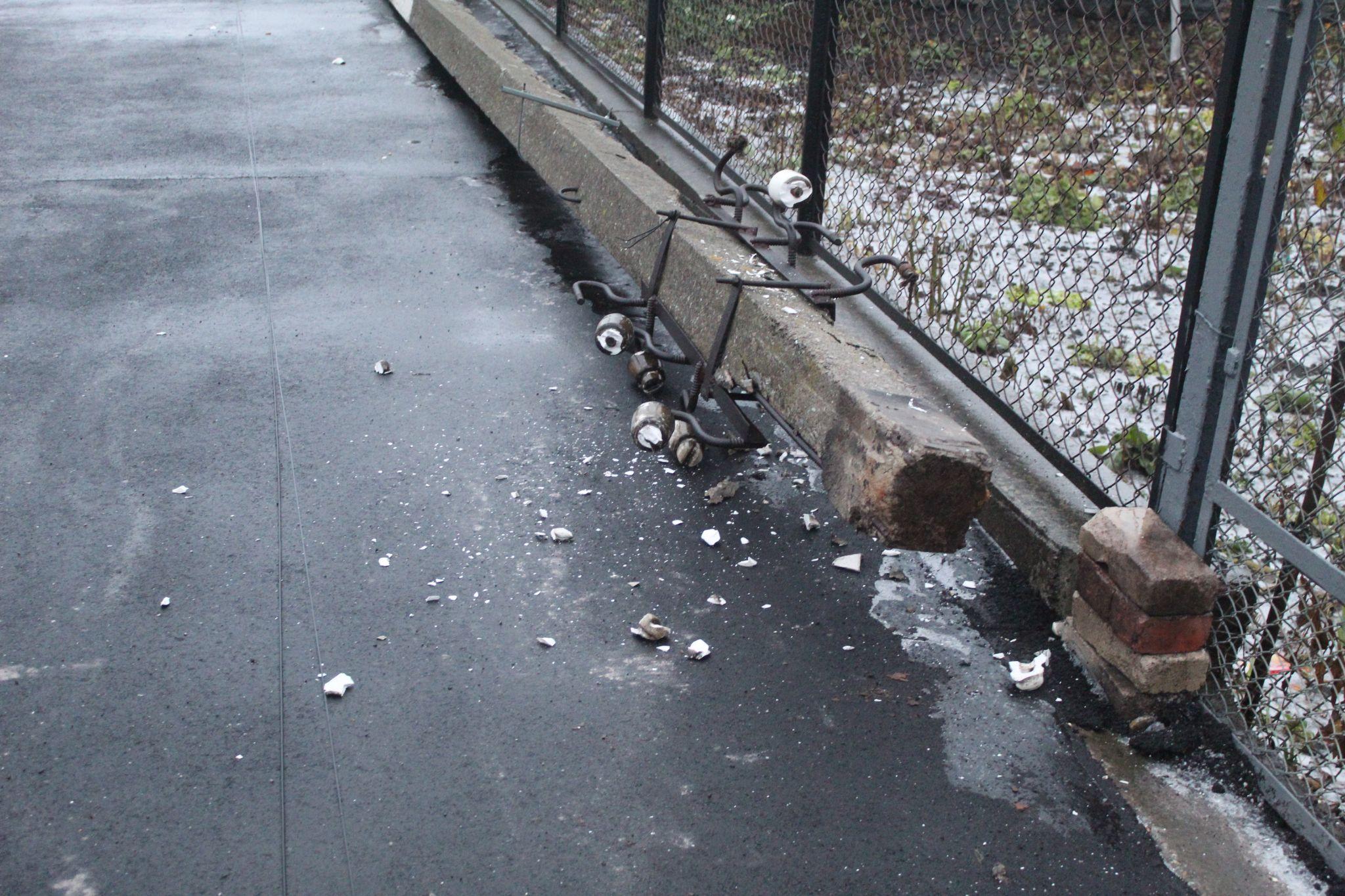 На тротуарі вулиці видніються діри від видалених стовпів. Самі стовпи та гострі частинки розбитих керамічних чаш лежать на тротуарі. Чашами іноді називають керамічні ізолятори, на яких кріпляться електричні дроти. Щодо дірок у новопокладеному асфальті питання не до енергетиків, а до тих хто планував комплексні роботи ремонту вулиці Куликівського. Логічно заміну стовпів потрібно було проводити в той же час, коли на тротуарі корчували живі липи. Тоді ями після корчування дерев, які захищали домоволодіння від вітрів та давали місту кисень і ями від стовпів можна було засипати одним махом. Тільки не будемо шукати винуватого, можливо, це роботи спланували так, щоб двірники не залишились без роботи.