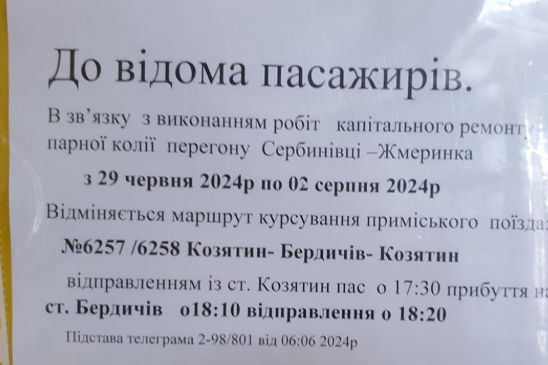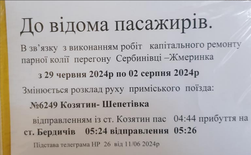 Також повідомляють і про зміни у розкладі руху електрички Козятин – Шепетівка через Бердичів.