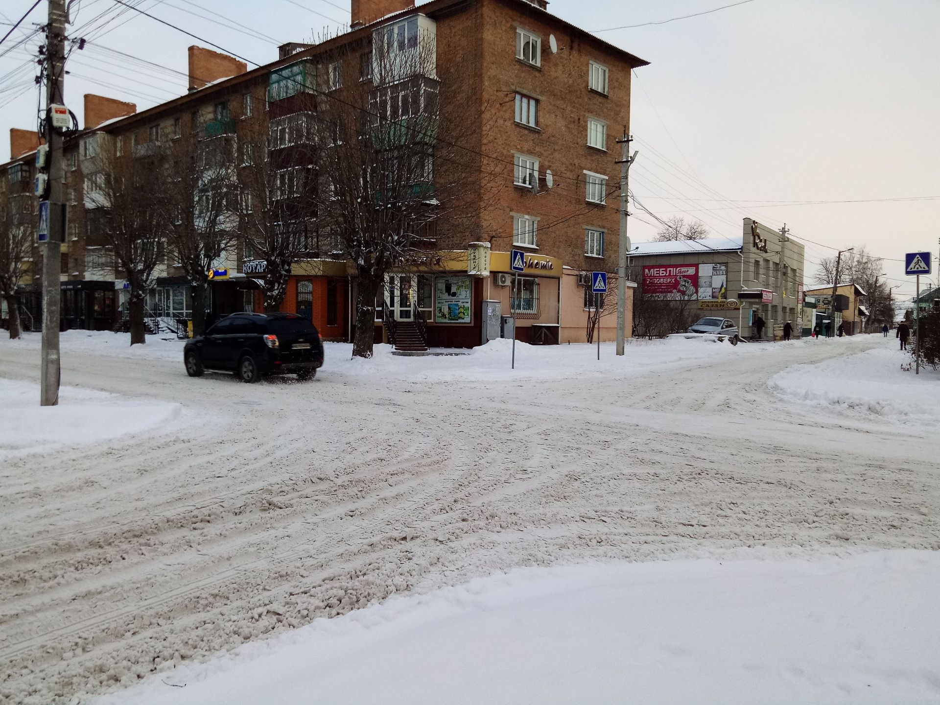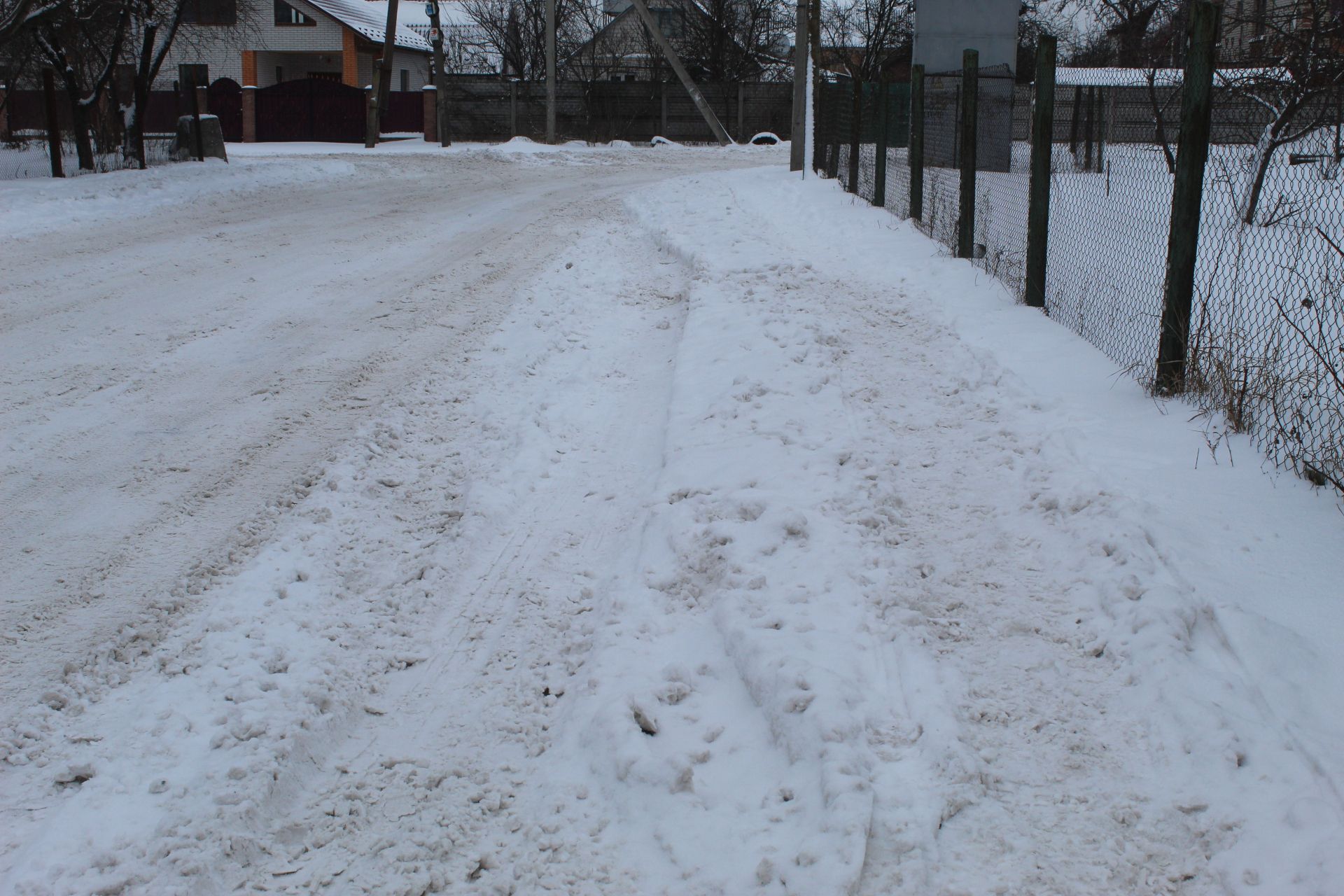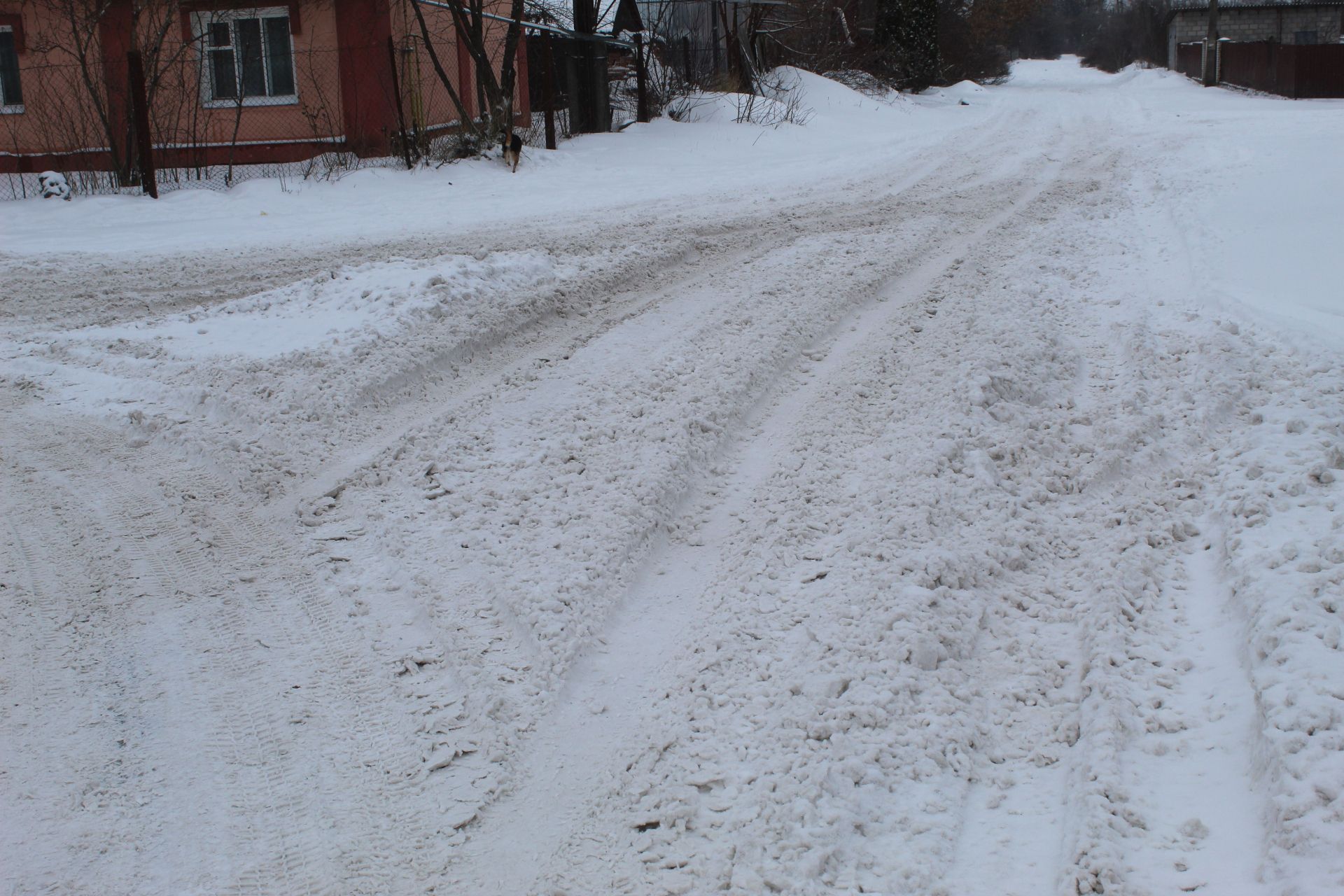 На фото вище чергова по переїзду прочищає прохід до другорядної вулиці. А на світлинах, які нижче, видно, як вранці виглядали вулиці Данила Нечая, перехрестя Шкільної та Червоної Калини і зупинка біля магазину «Берізка».