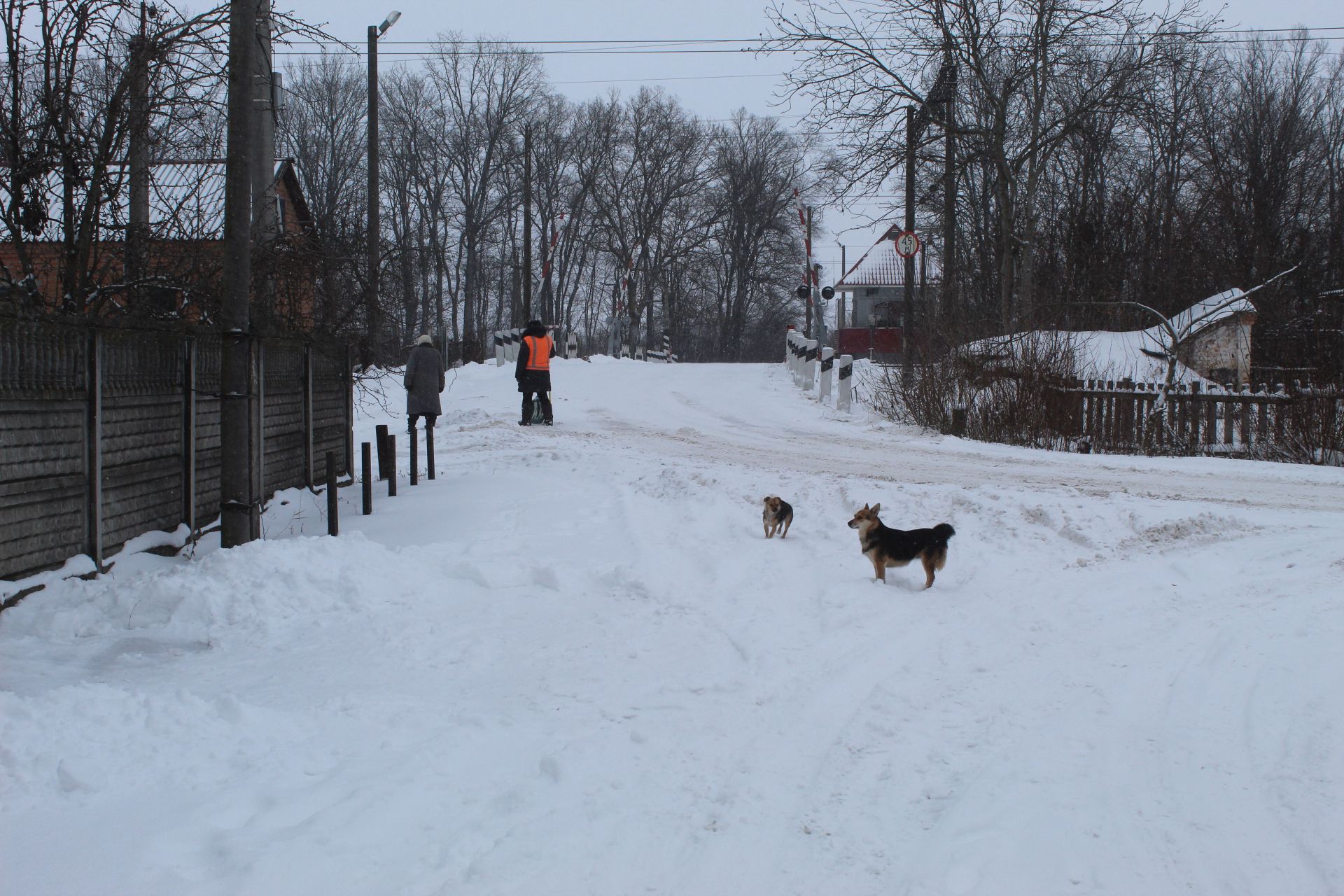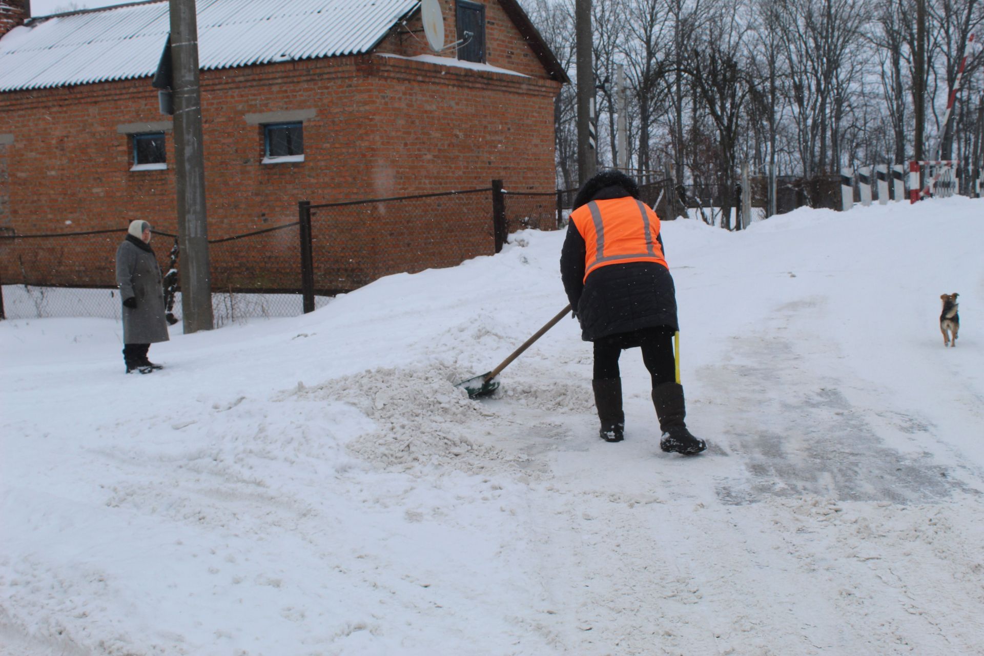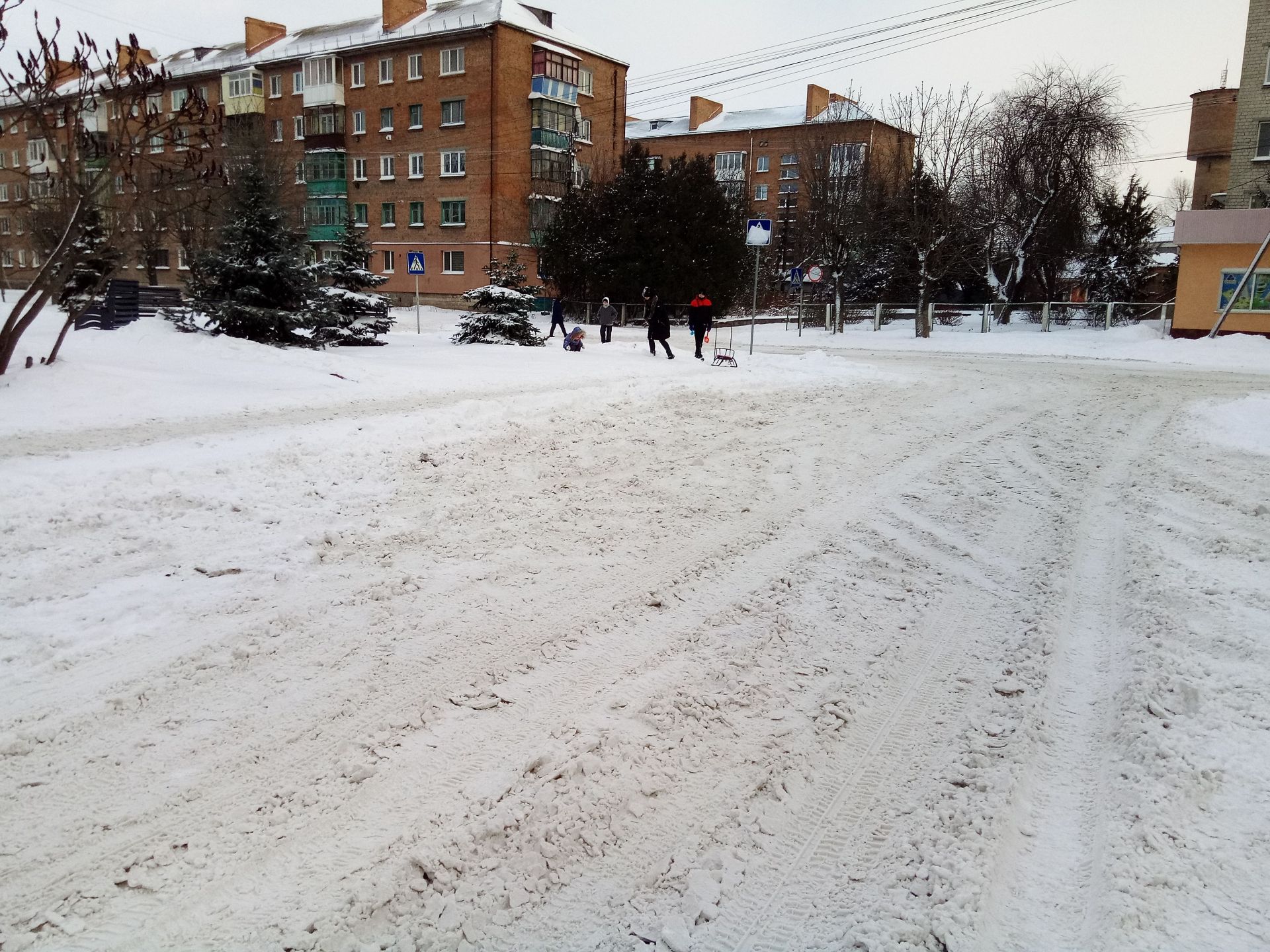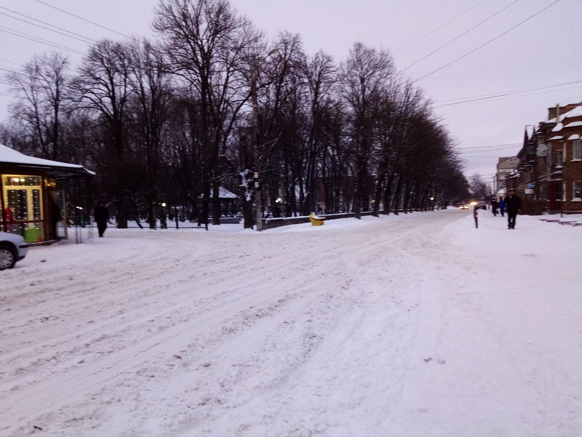 На фото вище чергова по переїзду прочищає прохід до другорядної вулиці. А на світлинах, які нижче, видно, як вранці виглядали вулиці Данила Нечая, перехрестя Шкільної та Червоної Калини і зупинка біля магазину «Берізка».