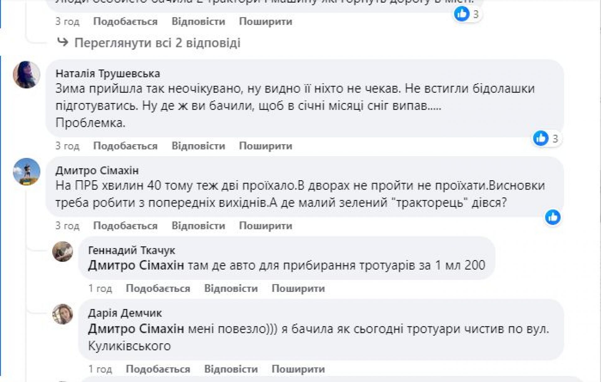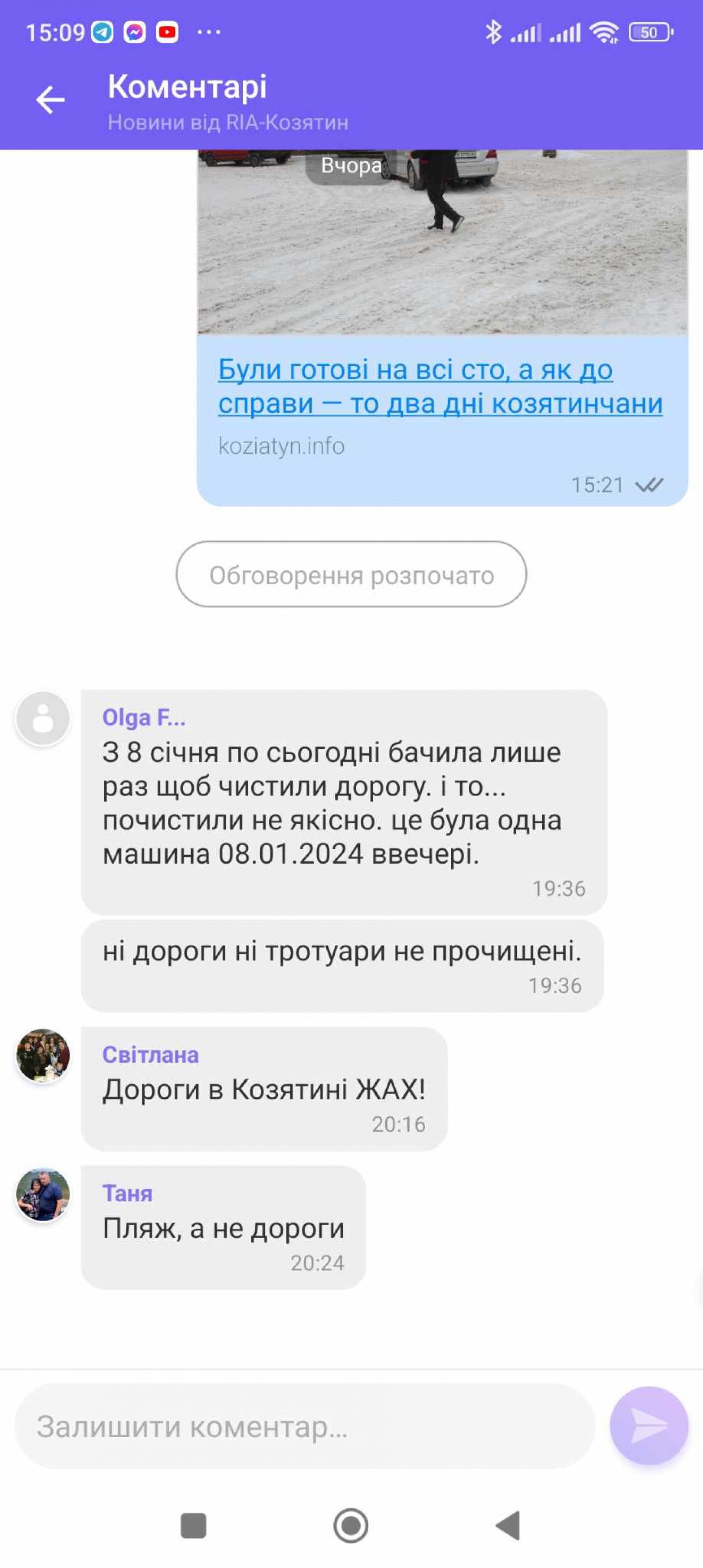 «Дороги у Козятині ЖАХ», «Не дороги, а пляж», «Результат чищення доріг нульовий, адже ковш майже в повітрі».