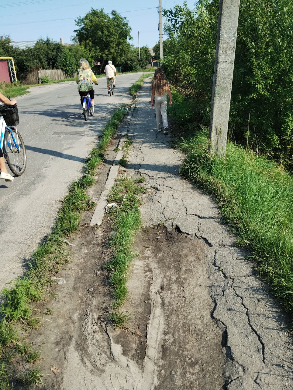 — Цей тротуар не ремонтувався зовсім, ото як його зробили ще надцять років тому і все на цьому, — розповідає мешканка села Ірина. — Раз на рік, в кращому випадку, його обкошують, а от ями тут такі, що можна ноги покрутити. Вони зробили велодоріжку по Куликівського! Питається, для чого? Хто там їздить? Ви подивіться скільки тут велосипедистів, із села Козятин і з Іванківців. Тут би вона була більш доречнішою. Хотілося б дізнатися, чи будуть робити в цьому році тротуари по селах, не тільки по місту.