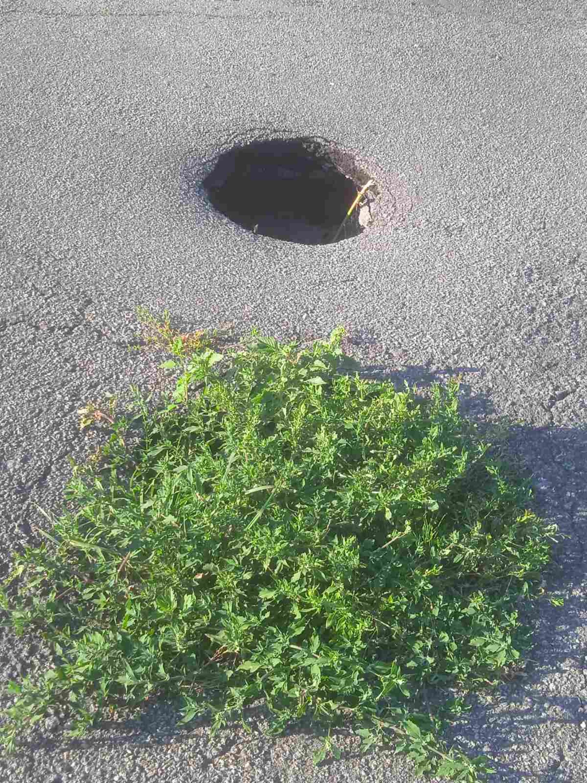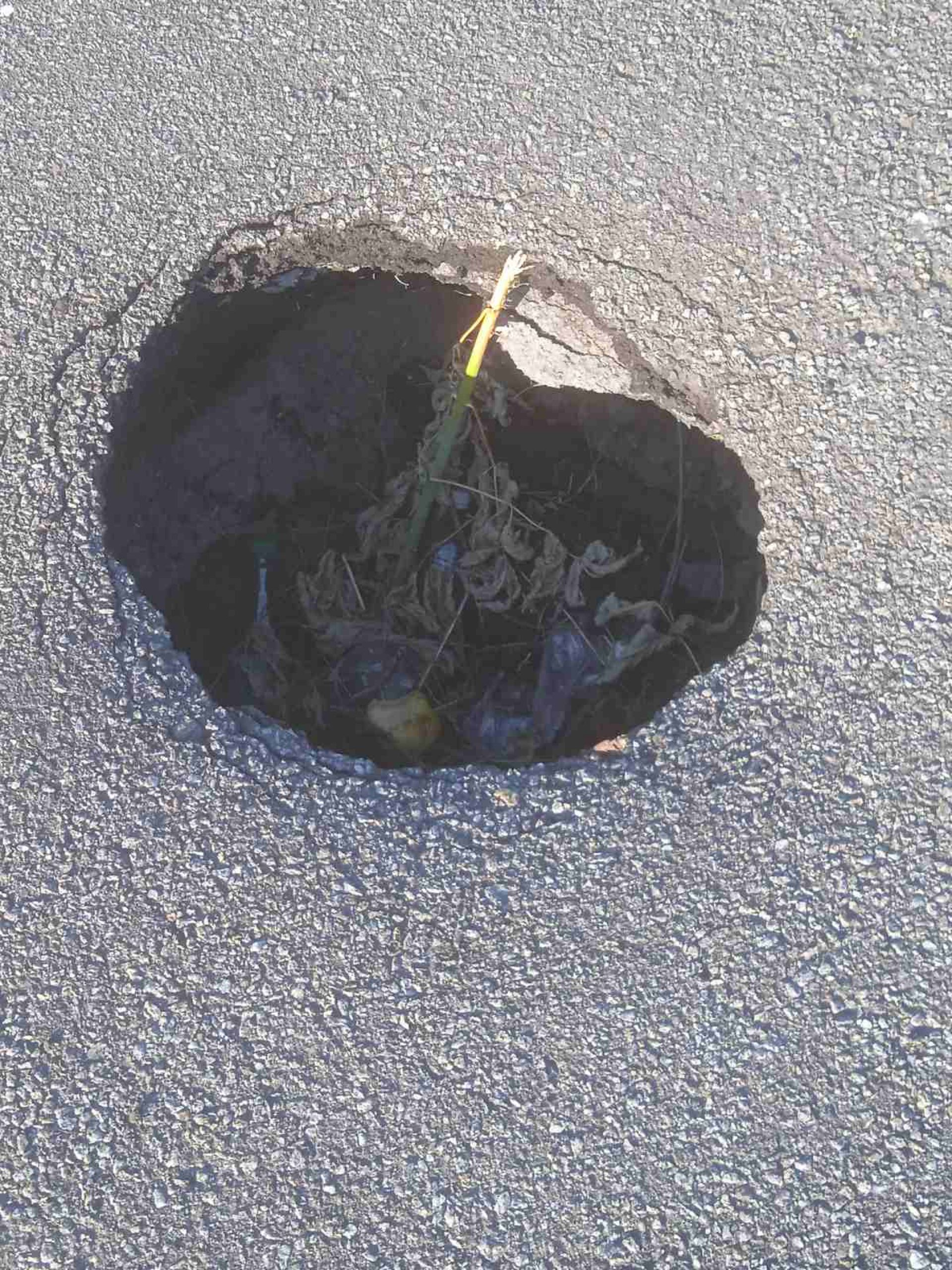 На надісланих, як доказ цього фото, цей провал дороги схожий на якийсь портал. Видно, що він глибокий і чималий в діаметрі.