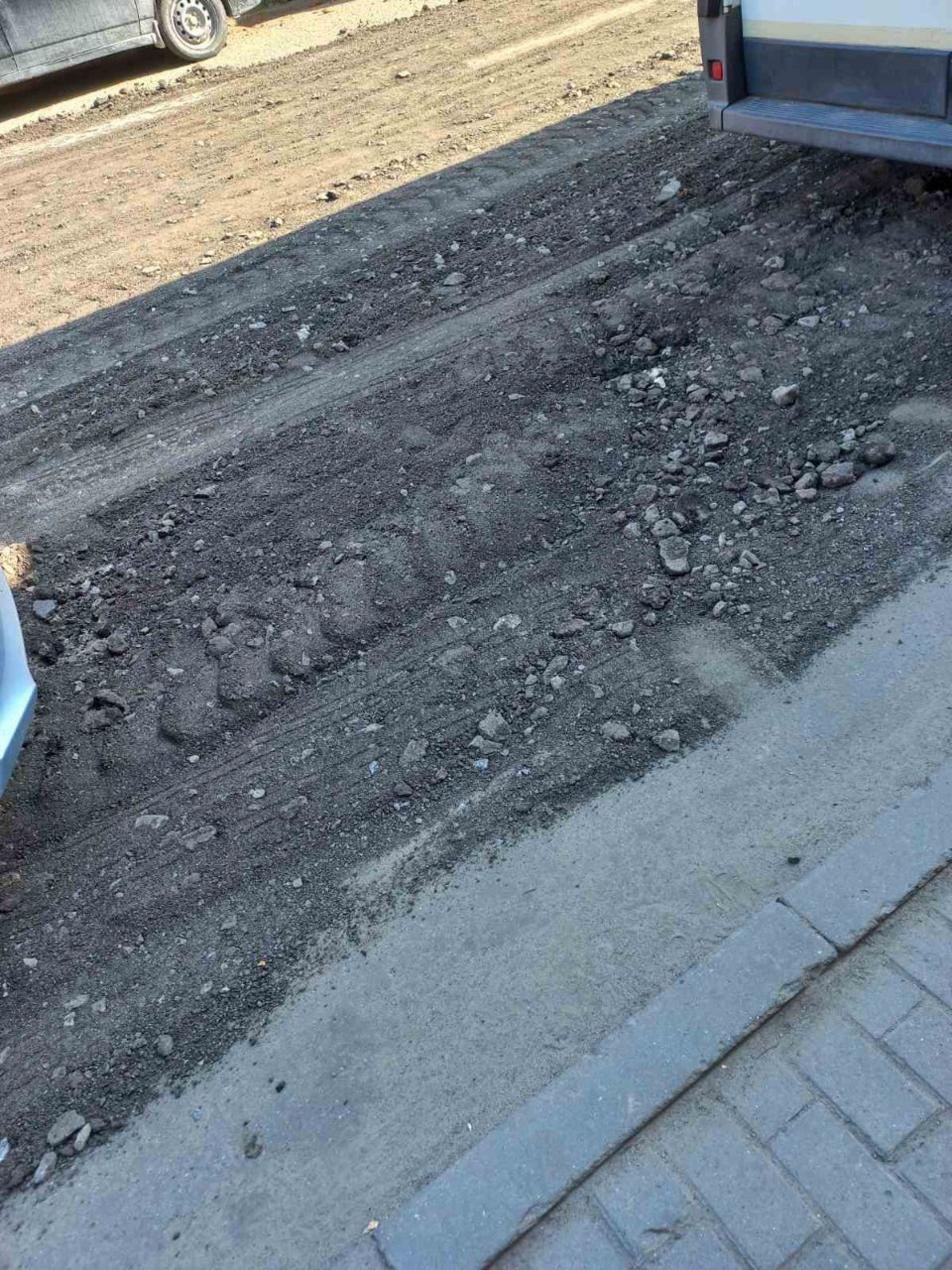 Отож, сьогодні 20 серпня і на Винниченка кипить робота — трактори, вантажівки, комунальники з лопатами. Засипають ями та втрамбовують все. Однак відразу так і не зрозумієш, що це за суміш.