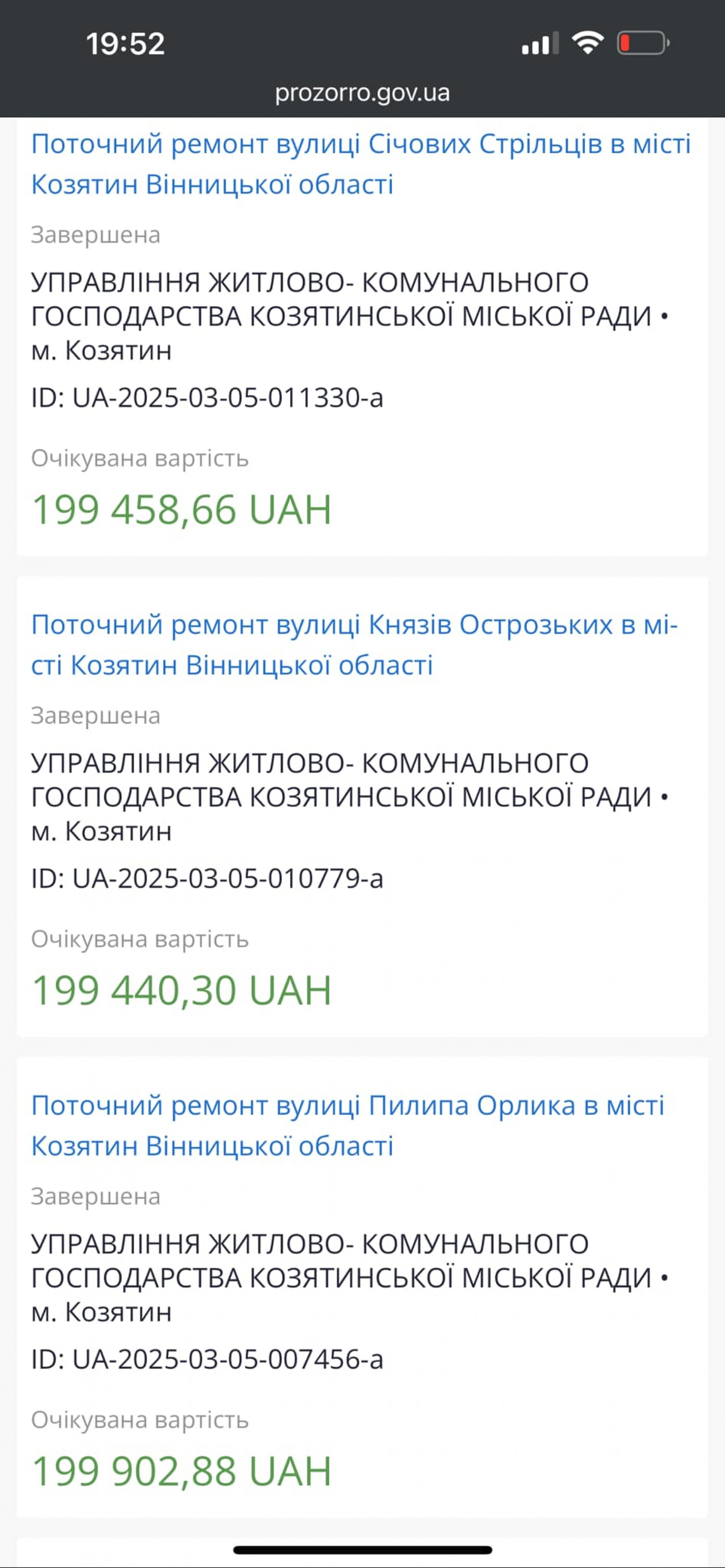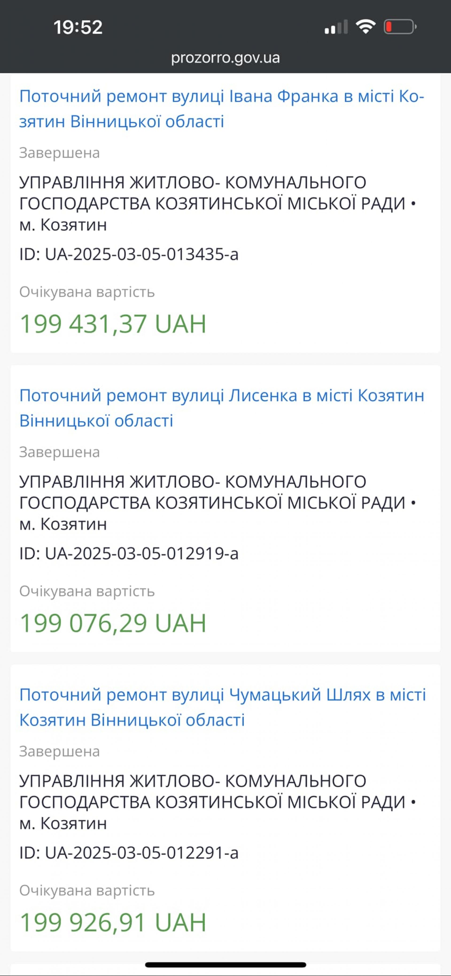 — Дивні співпадіння чи не так? Ми ж змінили владу, бо нас не влаштовував «схематоз»! Чи не так? Те, що щось робиться це добре, але ще краще коли це робиться чесно, правильно, законно і з виконанням обіцянок даних людям, — підсумував Олександр і додав скріншоти з «Prozorro», де вказана очікувана вартість виконаних поточних ремонтних робіт вищезазначених вулиць. Скрізь приблизна сума — трохи більше 199 тисяч гривень