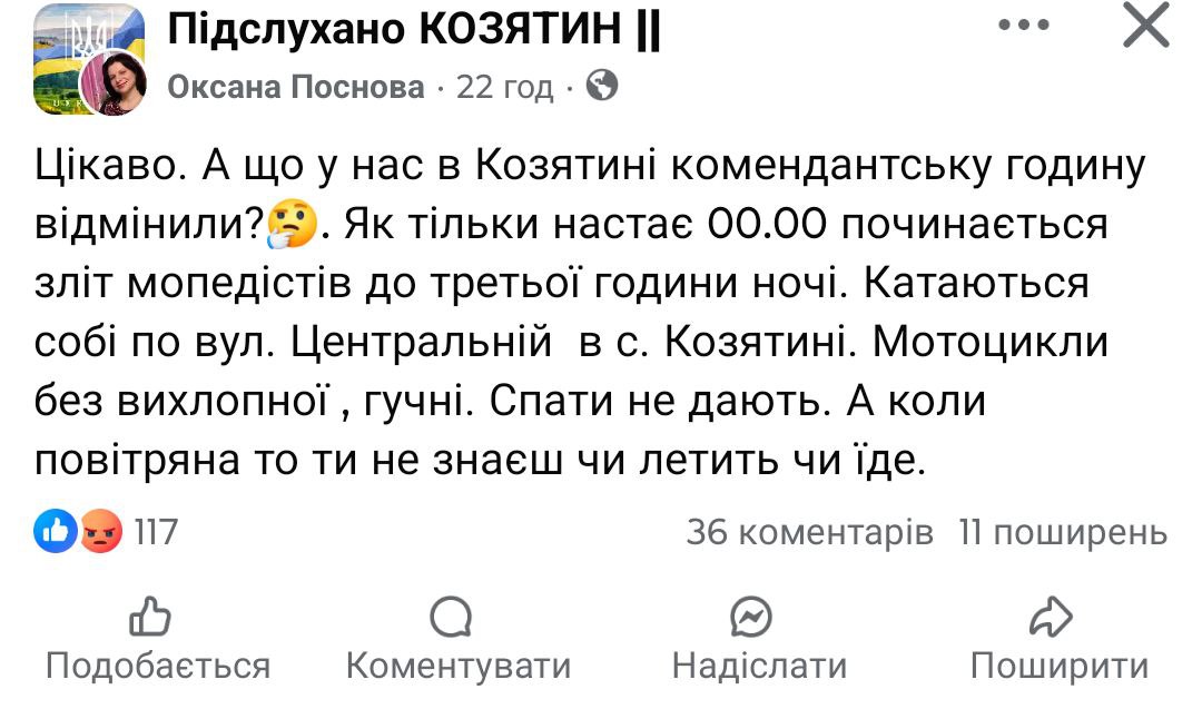 «Цікаво. А що у нас у селі Козятині комендантську відмінили? Як тільки настає 00:00 починається зліт мотопедистів до третьої години ночі. Катаються по вулиці Центральна. Вони без вихлопної, гучні. Спати не дають, а коли повітряна тривога, то ти не знаєш чи летить чи їде» — написала Оксана Поснова у одній із місцевих груп у фейсбуці.