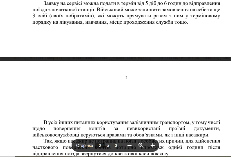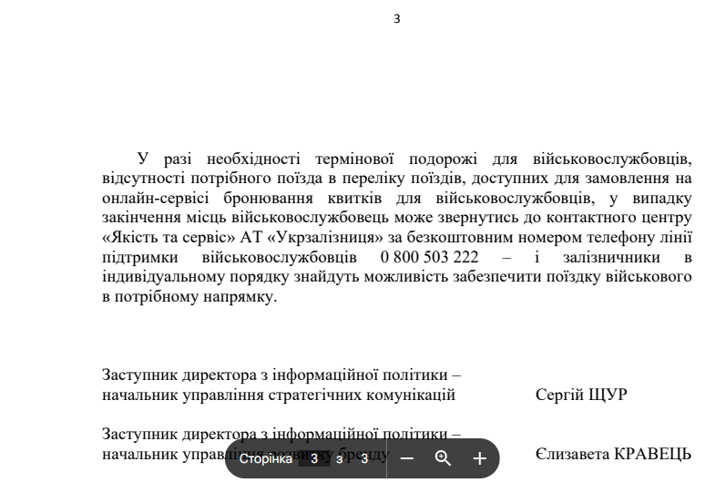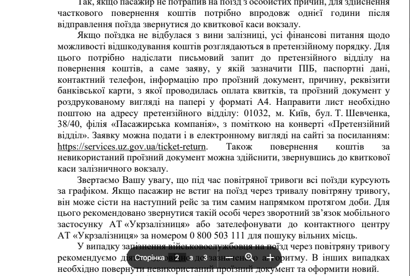 «В усіх інших питаннях користування залізничним транспортом, у тому числі щодо повернення коштів за невикористані проїзні документи, військовослужбовці керуються правами та обов’язками, як і інші пасажири. Якщо пасажир не потрапив на поїзд з особистих причин, для здійснення часткового повернення коштів потрібно впродовж однієї години після відправлення поїзда звернутися до квиткової каси вокзалу», — йдеться у відповіді на запит.