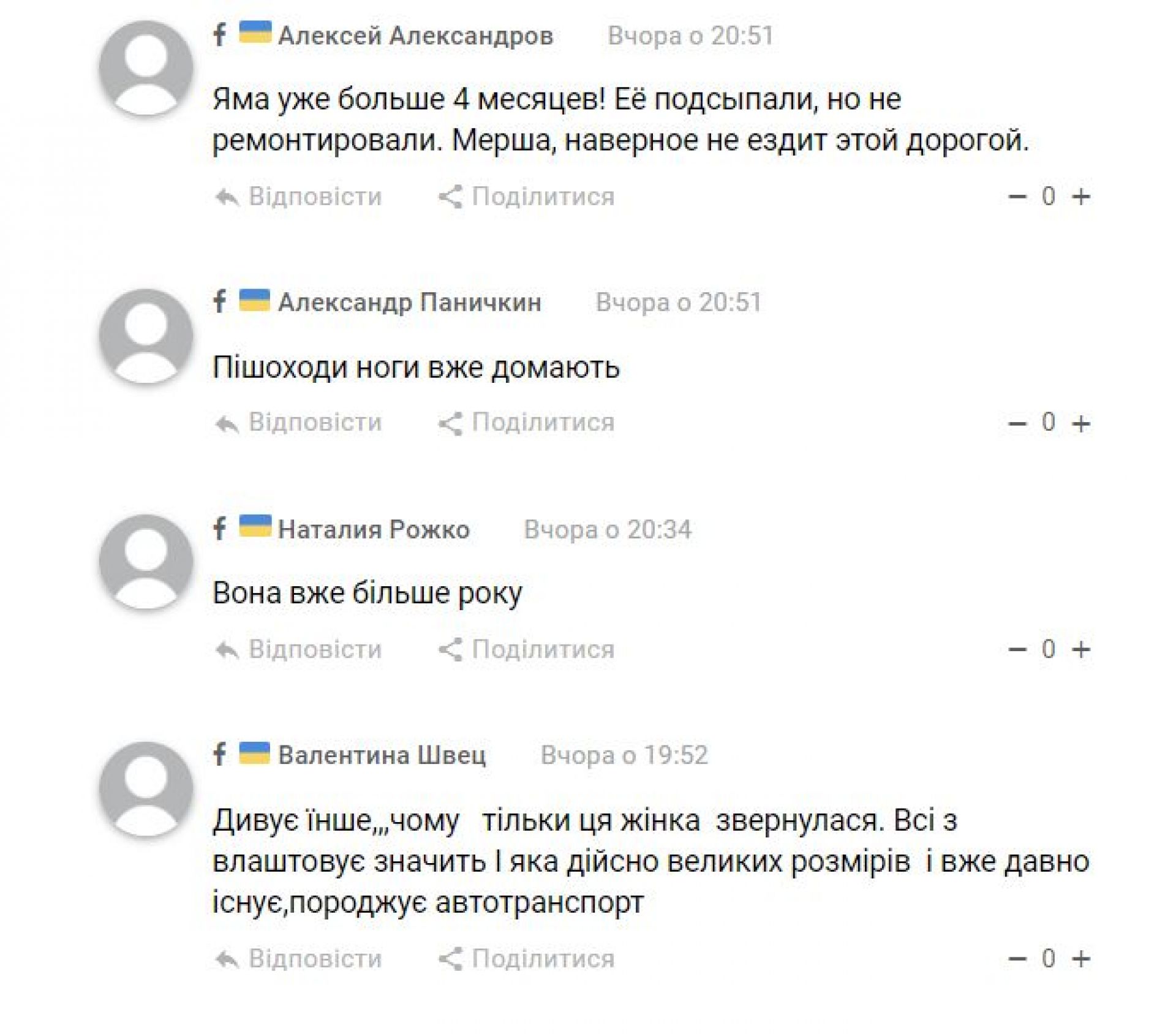 Згодом під’їхала жителька одного із приватних будинків, що знаходяться поруч з траншеєю. Вона розповіла, що два тижня тому приходила представниця міської влади і обіцяли, що все зроблять. Але натомість яму знову засипали щебнем, який вже за кілька днів розсунувся по бокам і вона стала такою ж як і була.