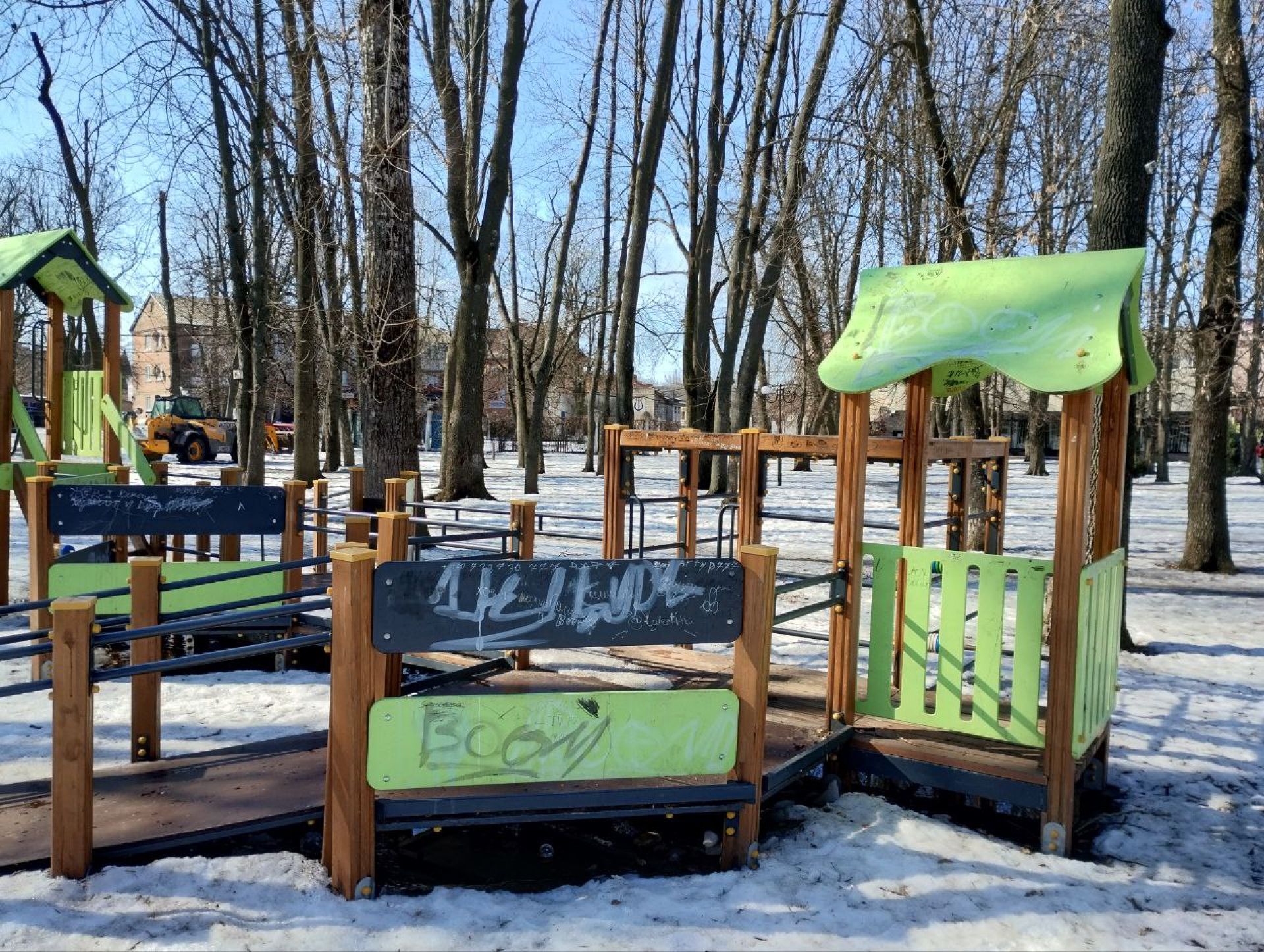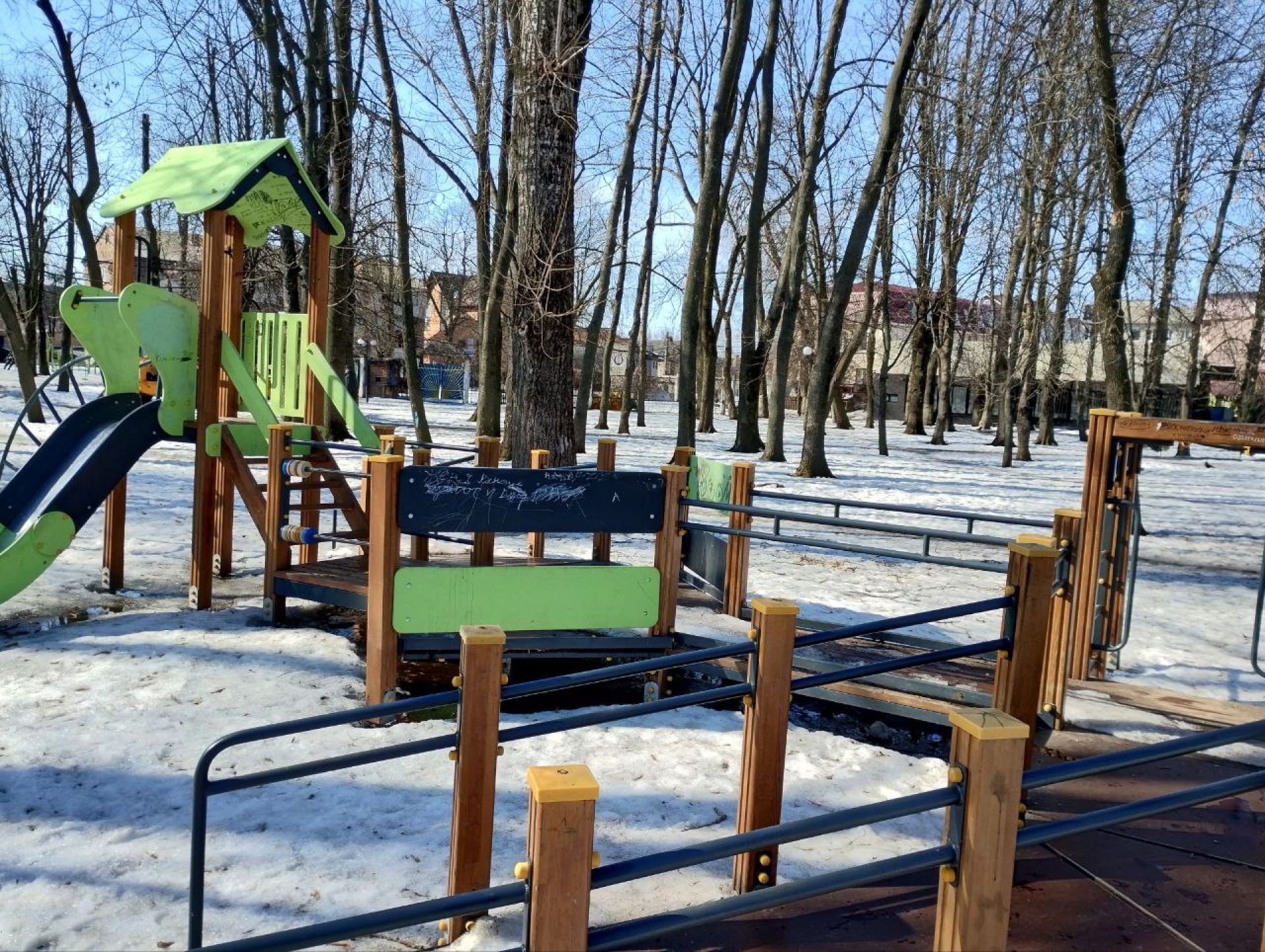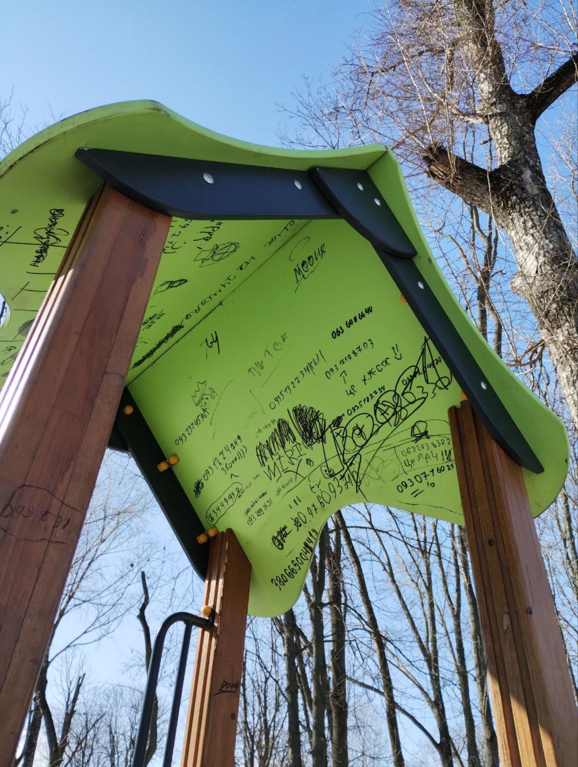 - Окрім цього, майже всі конструкції знаходяться у жахливому естетичному стані — вони розписані і пописані і маркерами, і фарбами з болончика. Тріснула і музична гітара. На жаль…