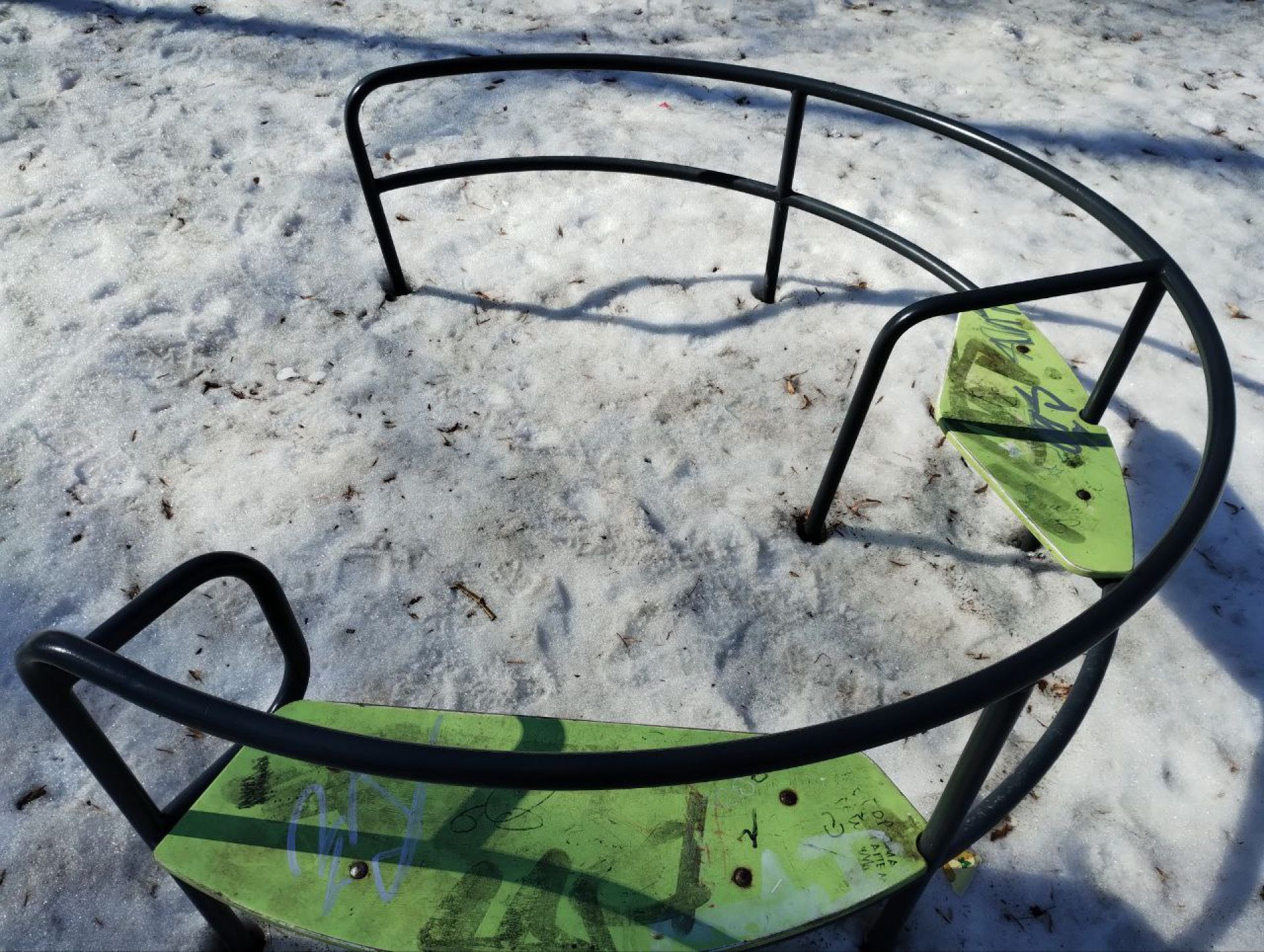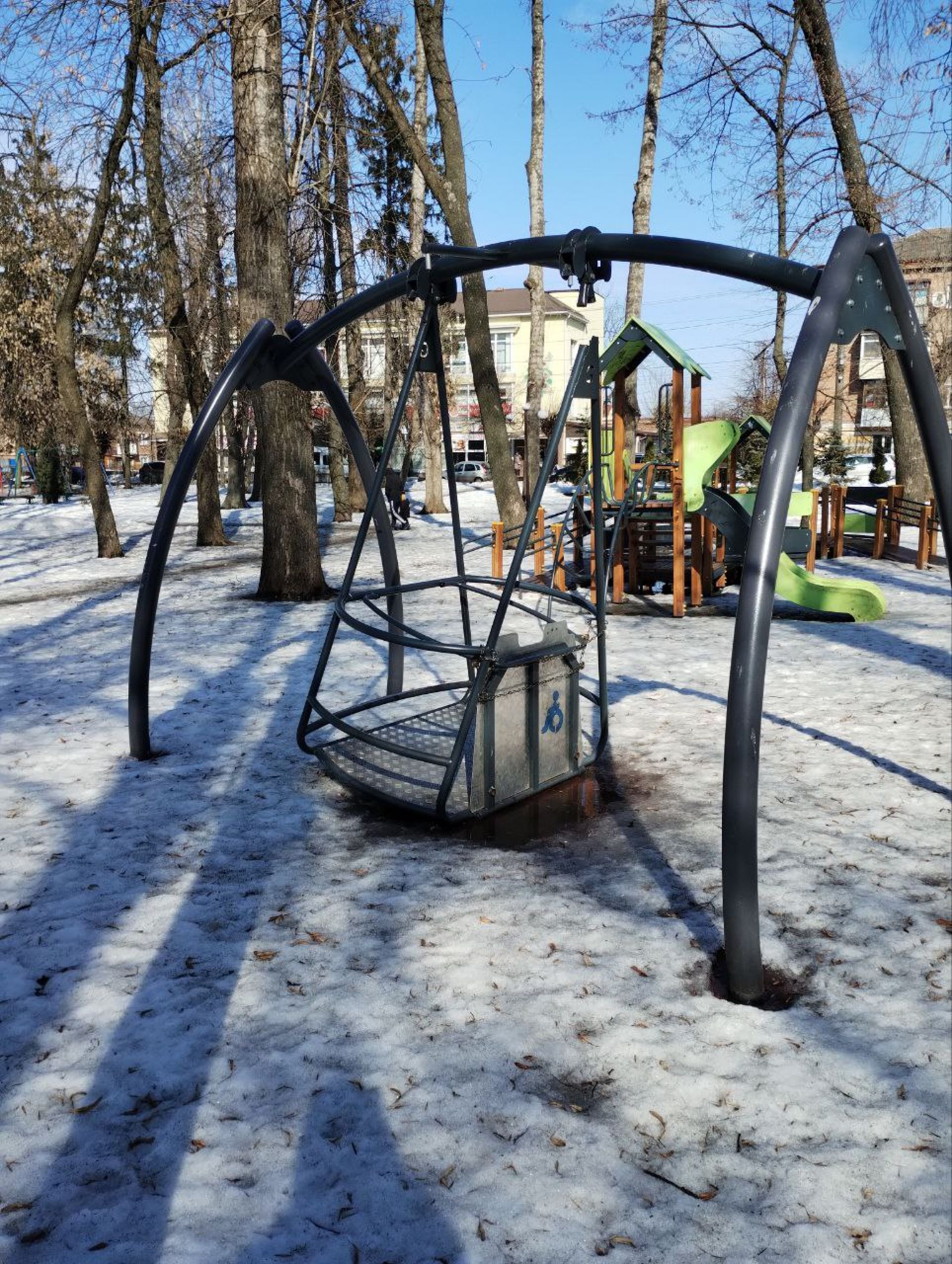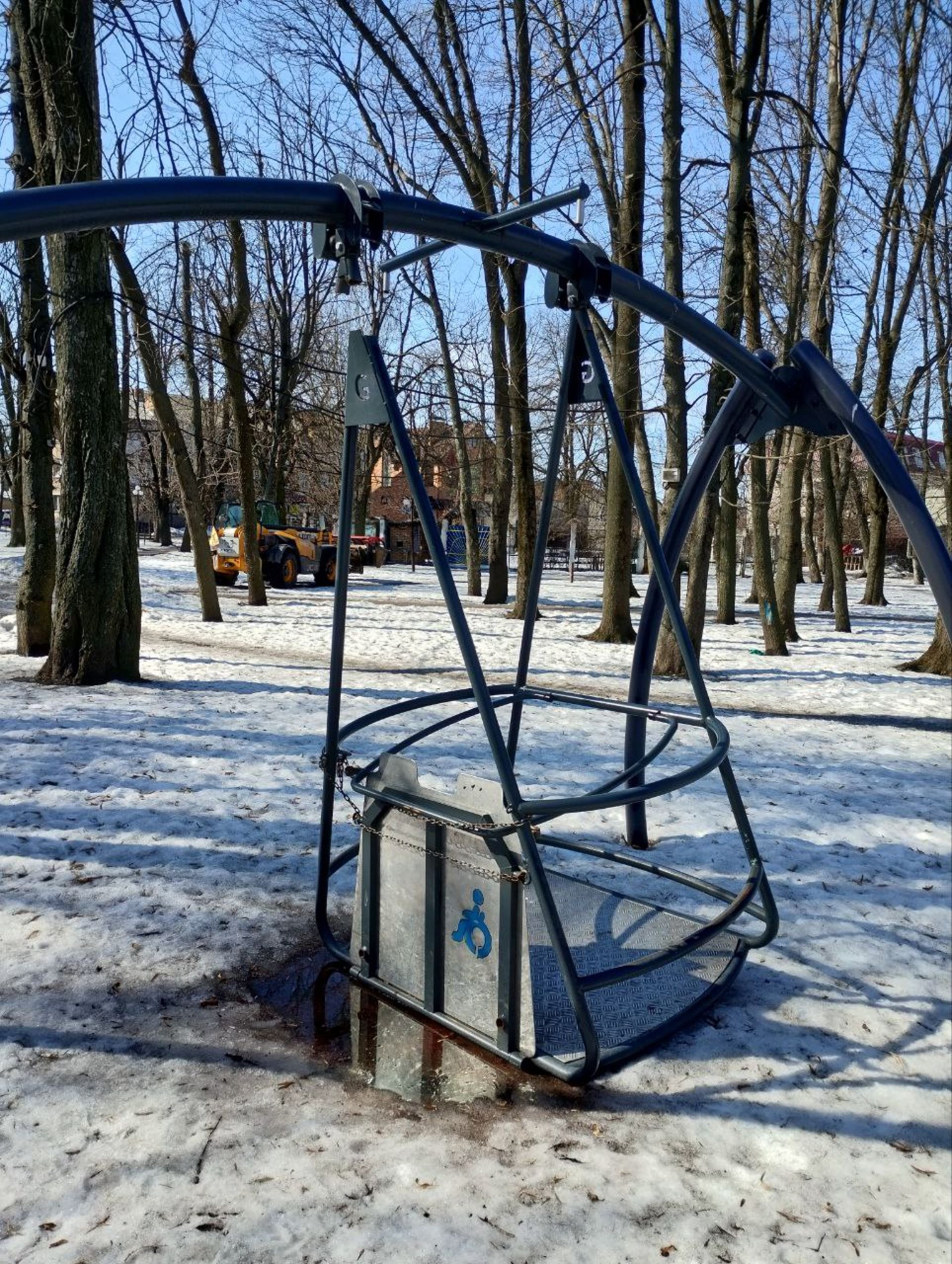 - Там тріснуло одне із залізних кріплень. Гойдалку перекосило, вона примерзла до землі.