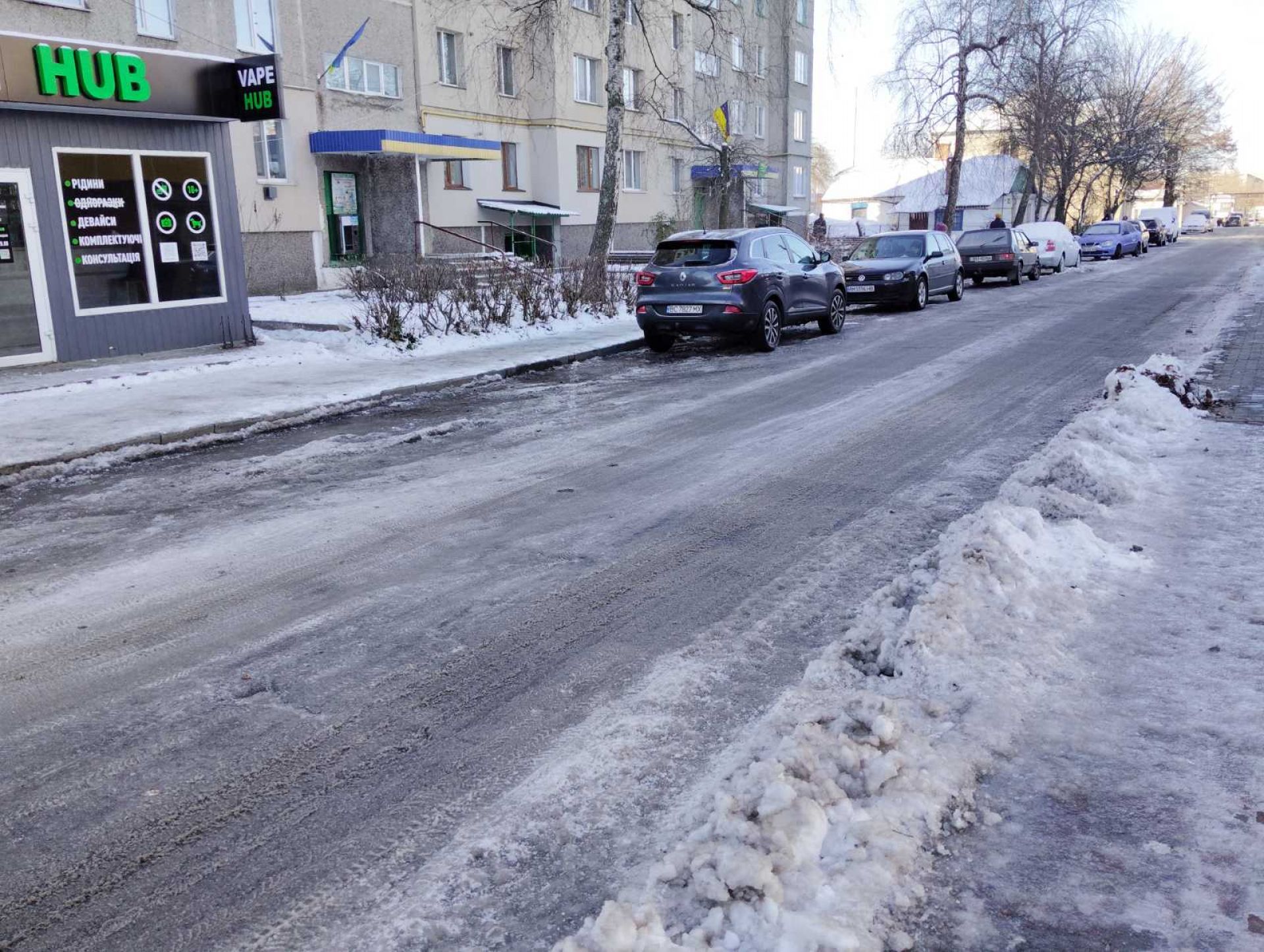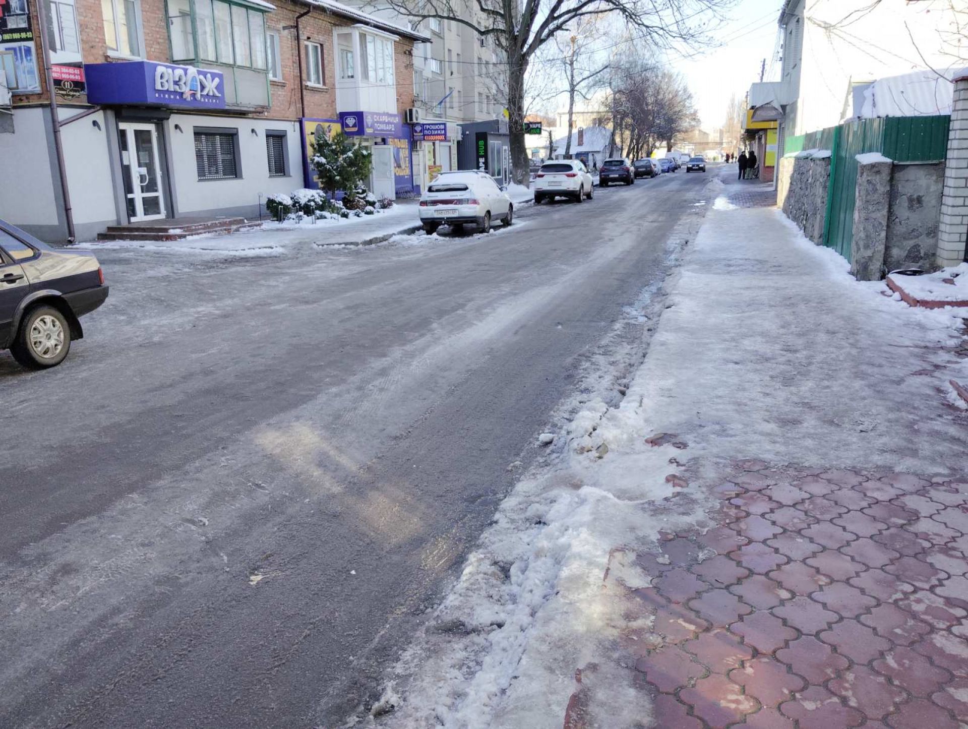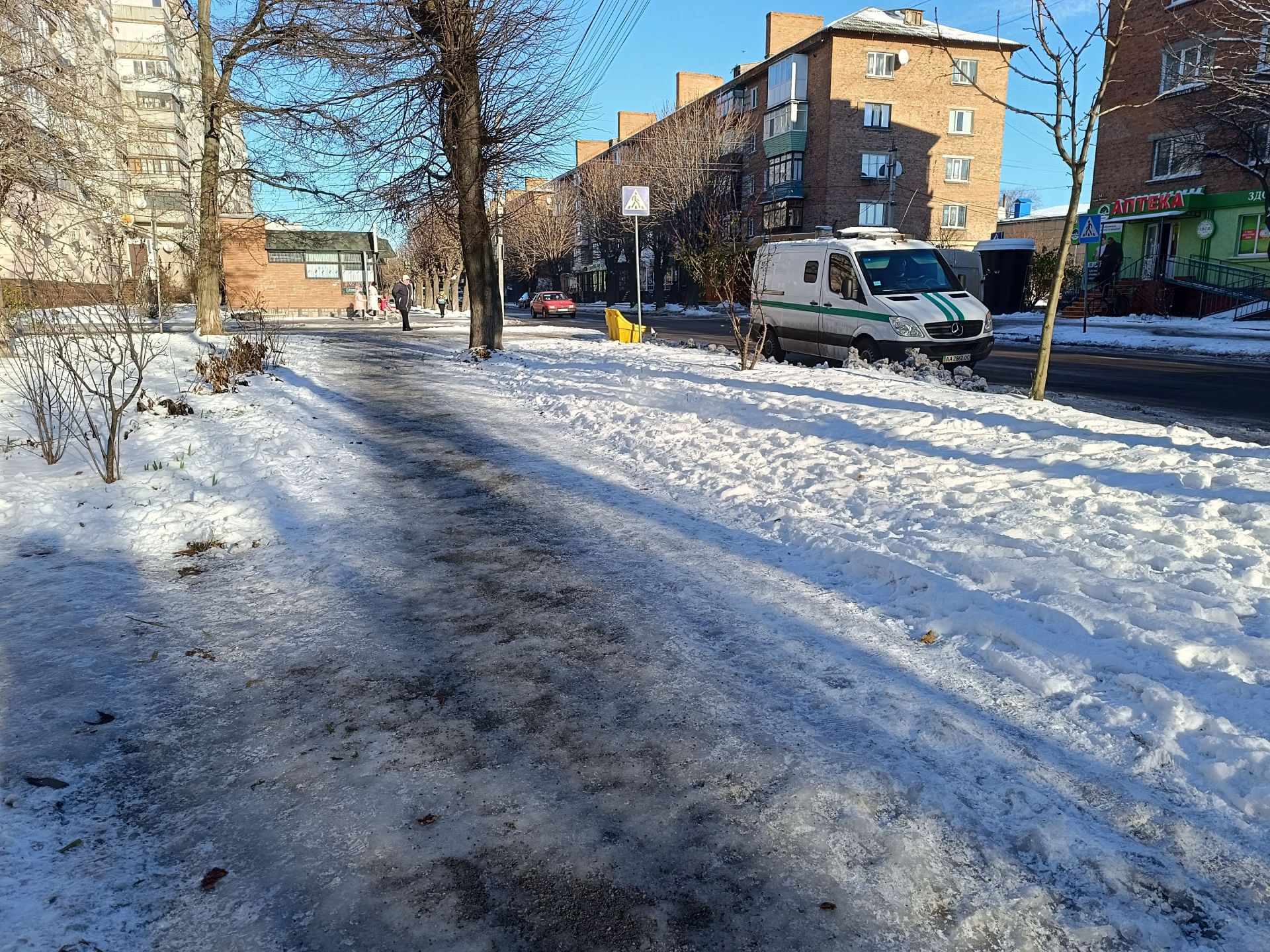 Справжня ковзанка нас чекала за колишнім районним будинком культури — на частині вулиці Склярова, що веде від перехрестя з Героїв Майдану до перехрестя з вулицею Грушевського, не посипані й не розчищені ані тротуар, ані проїжджа частина.