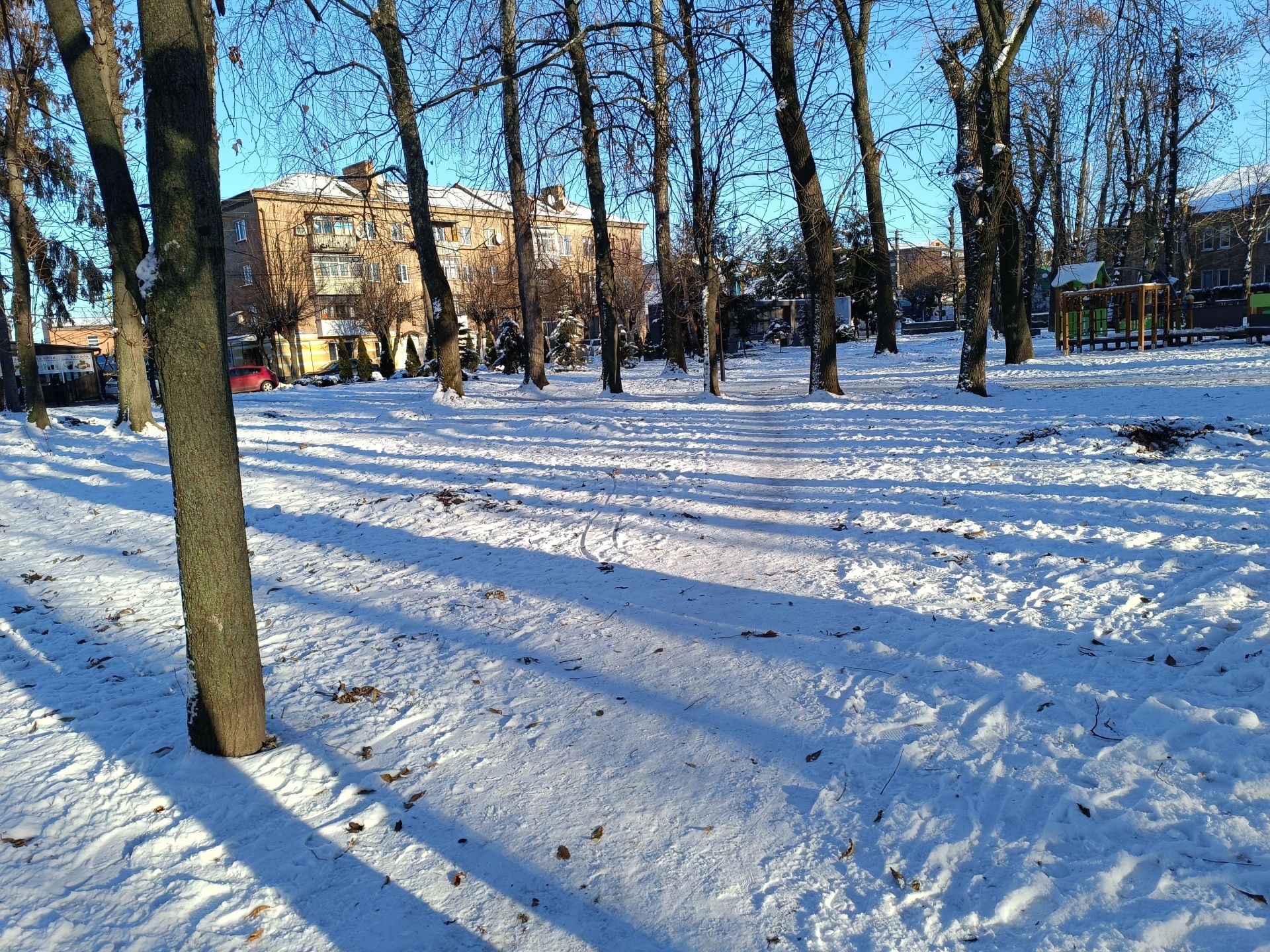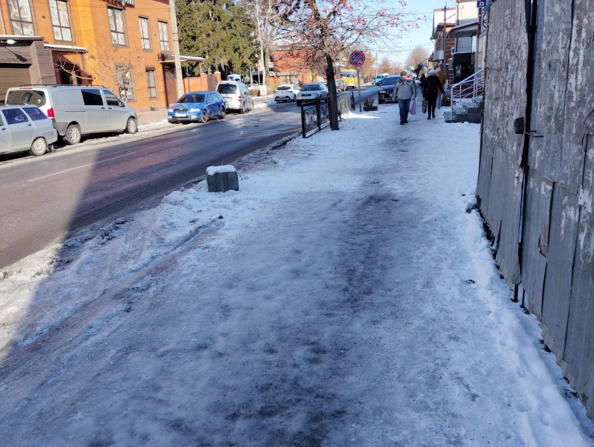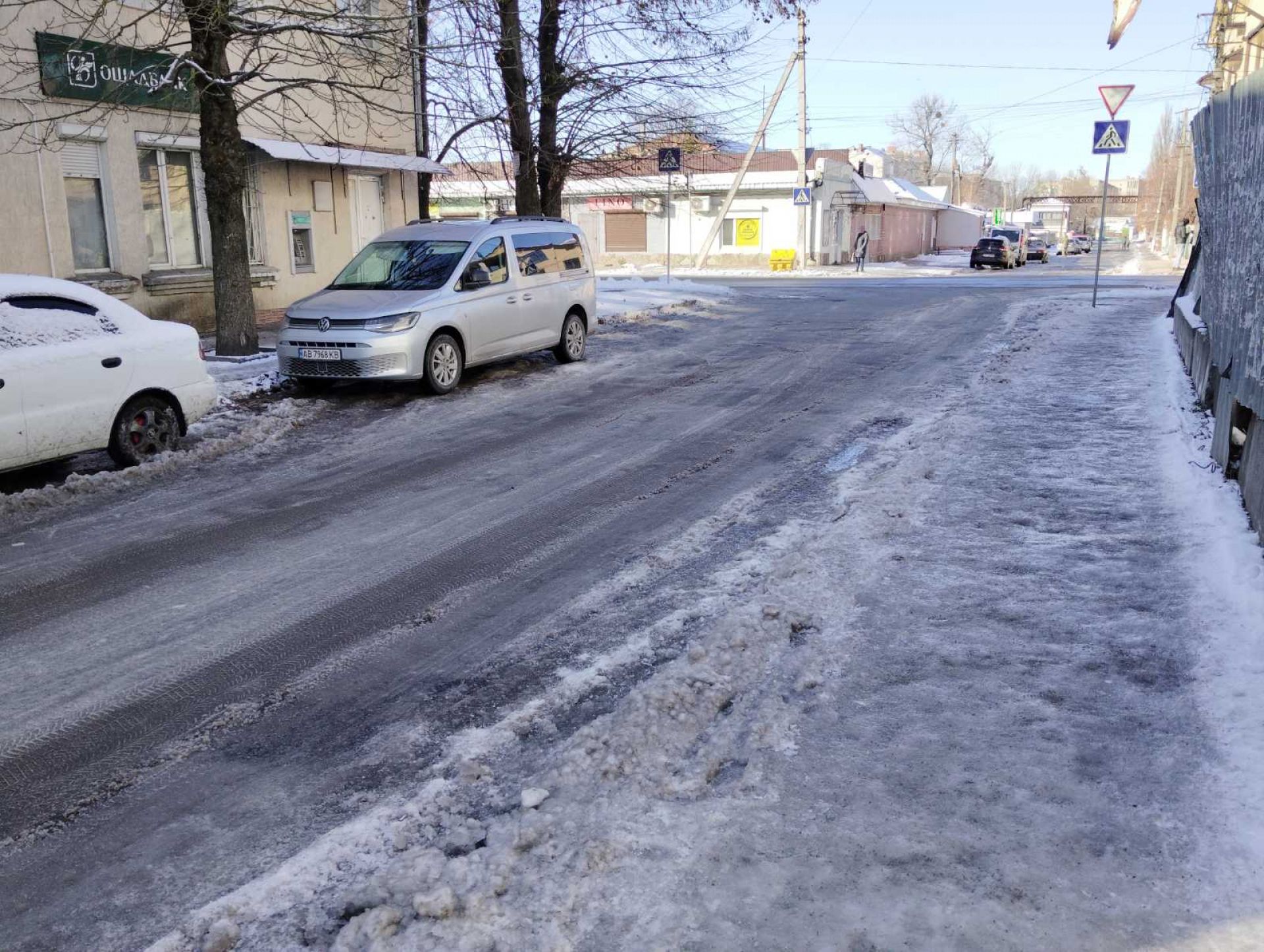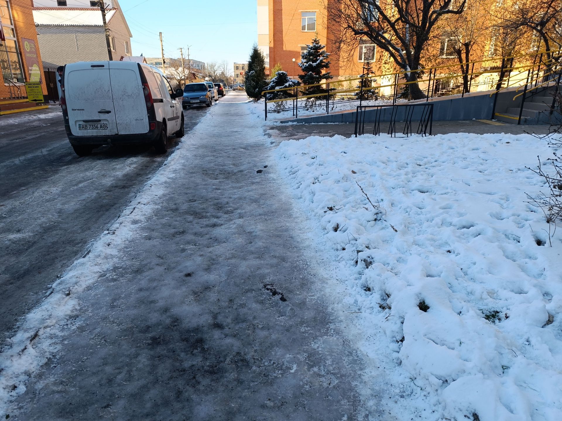 Справжня ковзанка нас чекала за колишнім районним будинком культури — на частині вулиці Склярова, що веде від перехрестя з Героїв Майдану до перехрестя з вулицею Грушевського, не посипані й не розчищені ані тротуар, ані проїжджа частина.