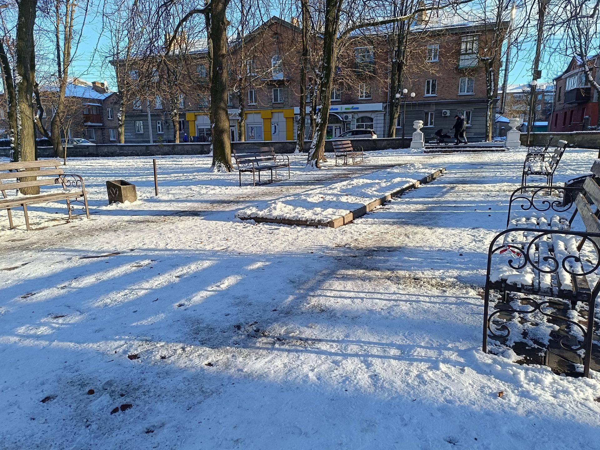 Вдруге ми вийшли на вулицю близько 13:15 і ситуація була вже значно краща — центральні вулиці Героїв Майдану і Січових Стрільців були уже посипані. Зазирнули у міський сквер. На проміжних стежках було дещо слизько, але центральні доріжки трохи посипали.