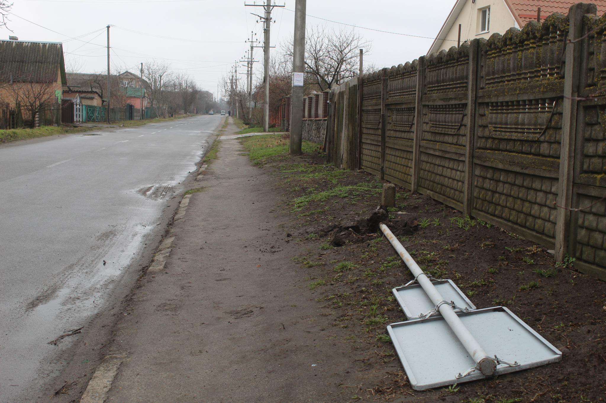 На зупинці громадського транспорту «провулок Партизанський» після рясних дощів впав вказівник автобусна зупинка. Погано що впав, але добре, що нікого не травмував.