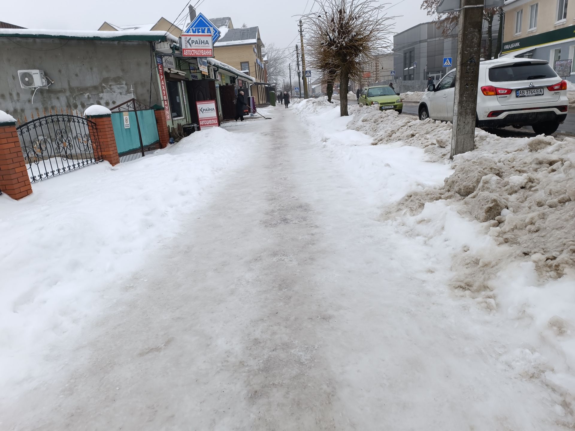 Напередодні Козятин скувала крига — вранці у вівторок, 27 січня мешканців міста зустріла ожеледиця. І якщо вдень по тротуарах (в тих місцях, де посипали) ще можна було бодай якось пересуватися, то ввечері на посипочну суміш ліг новий шар льоду. Не впасти — ще той квест. Простіше було виходити на проїжджу частину — у центрі міста дороги посипали сіллю, тож на асфальті такої сильної ожеледі, як на тротуарах, не було. На додачу ввечері почав моросити дощ, через що і без того слизькі пішохідні доріжки взагалі перетворилися на ковзанку.