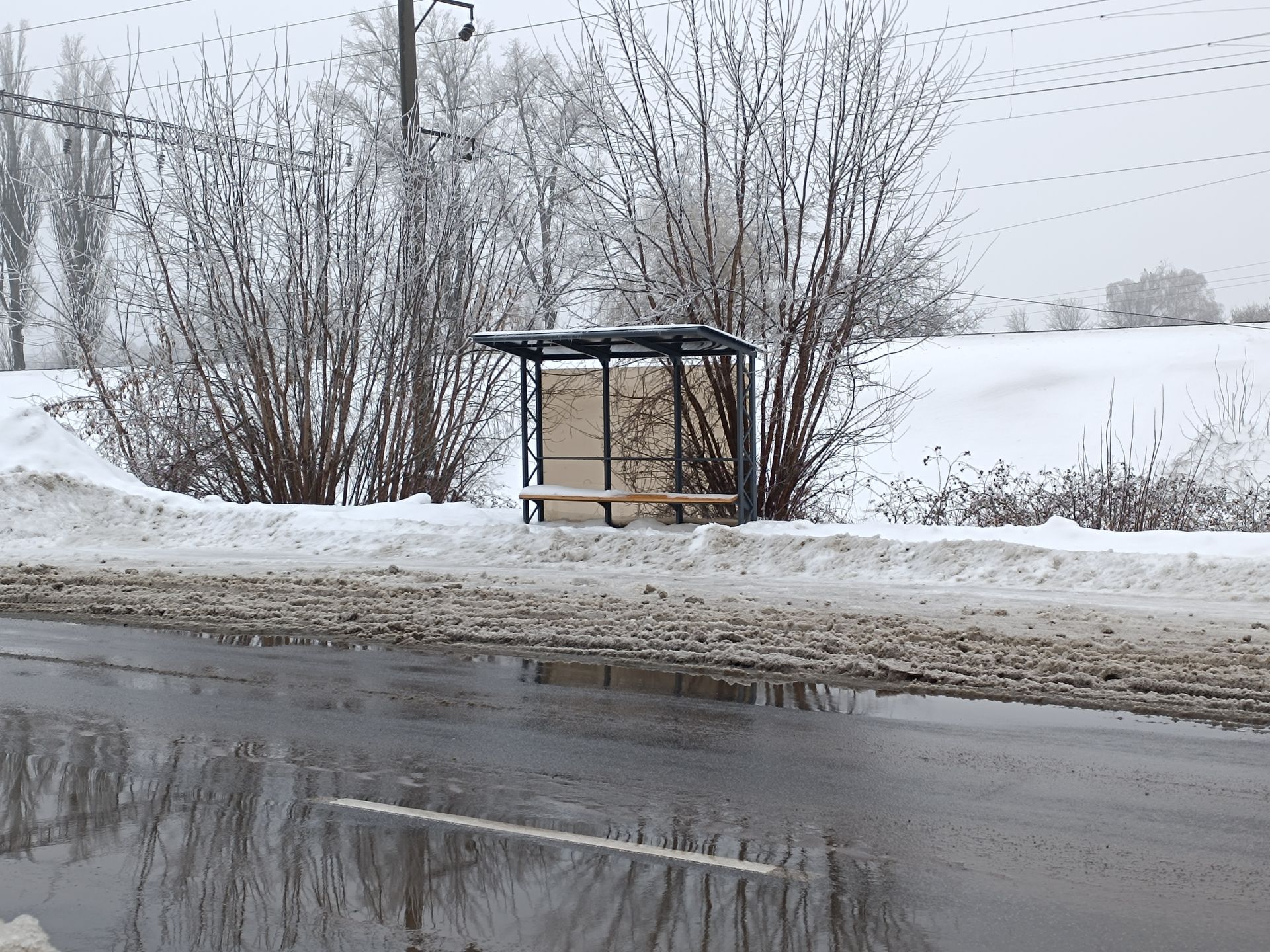 На зупинці біля будівлі патрульної поліції сьогодні посипали — видно свіжу посипочну суміш.