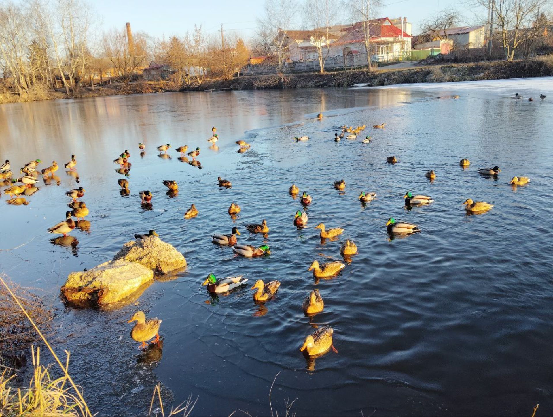 Праворуч від мосту, поряд з берегом справжня метушня. Швидко перебираючи лапками, тут плавають дикі качки та красені селезні. Ми нарахували більше п’яти десятків птахів. Із берегу мама з двома дітьми, які прийшли прогулятися на стадіоні, частують пернатих булкою. Той, хто більше зголоднів, крутиться ближче до берега. Ті, що не чекають поживи, плавають подалі і навіть виходять на лід.