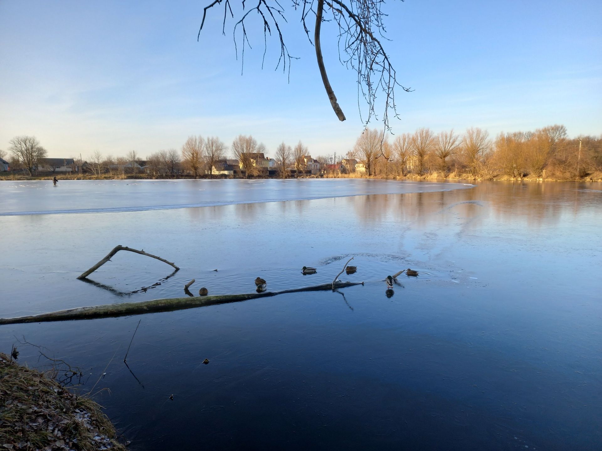 По той бік берега плесо річки вкрило кригою ще більше. Не замерзлою залишилася лише невелика смужка води, куди колись обвалилося дерево. Тут теж пернаті, щоправда, їх значно менше — плавають чотири качки і два селезня.