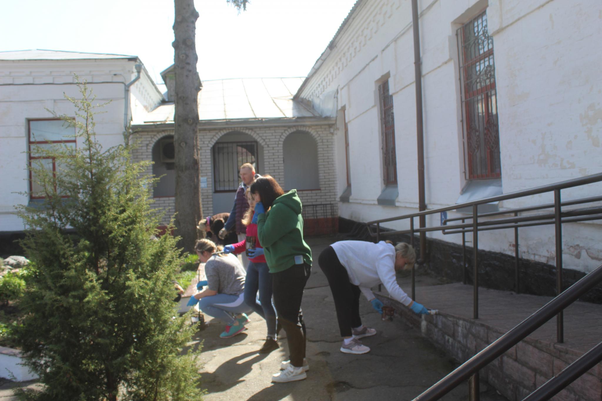На подвір’ї ЦНАПу було багатолюдно. Працівники адміністративних послуг вийшли на прибирання території, а найбільшої уваги вони приділяють миттю вікон, білінню бордюрів і висадці квітів у квітнику.