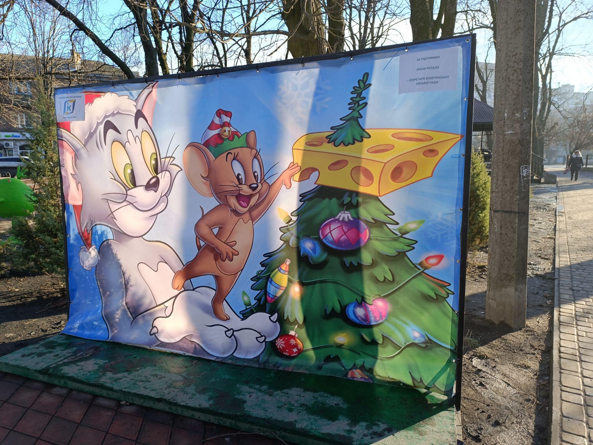 Що цікаво, сусідня фотозона праворуч, на якій зображені герої мультфільму «Том і Джері» ціла і неушкоджена. Певно, пориви вітру з цього боку алеї не такі сильні.