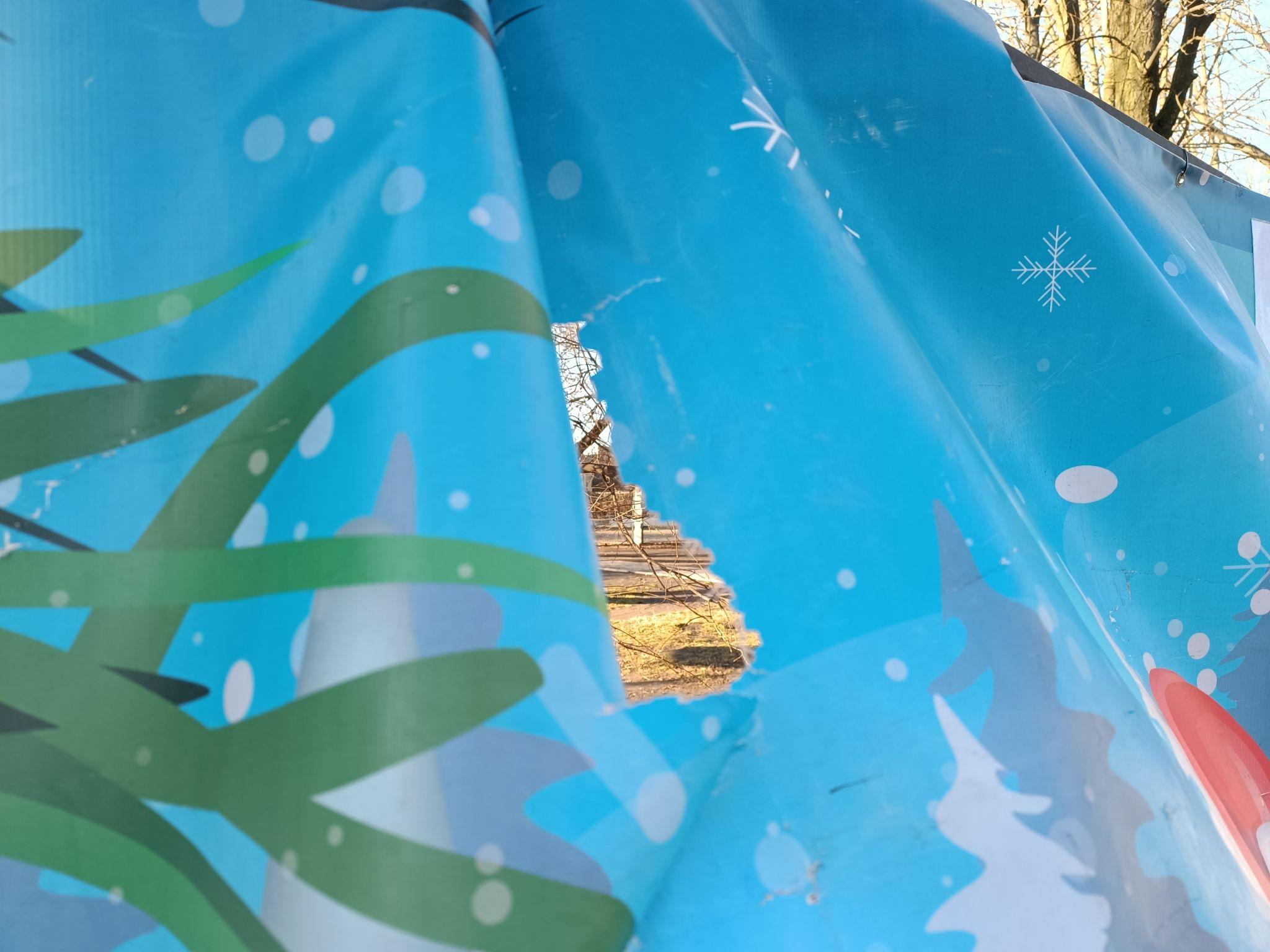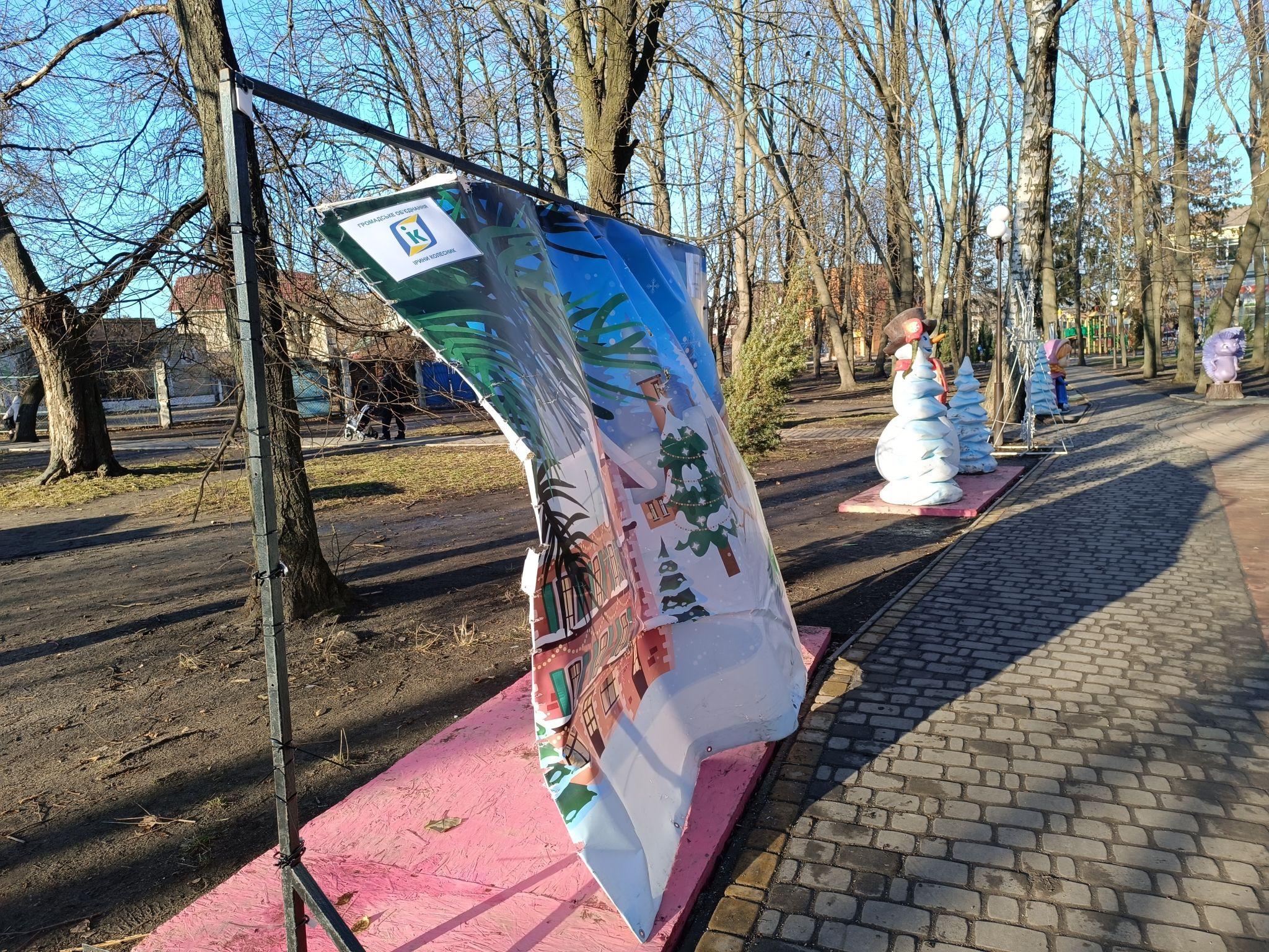 Два тижні тому наші журналісти проходили через парк і помітили, що одна із фотозон Різдвяного містечка зазнала пошкоджень. А днями ми побачили, що пошкоджених банерів стало вже більше. Деякі з них тепер більше нагадують вітрила корабля у відкритому морі, ніж фотозони.
