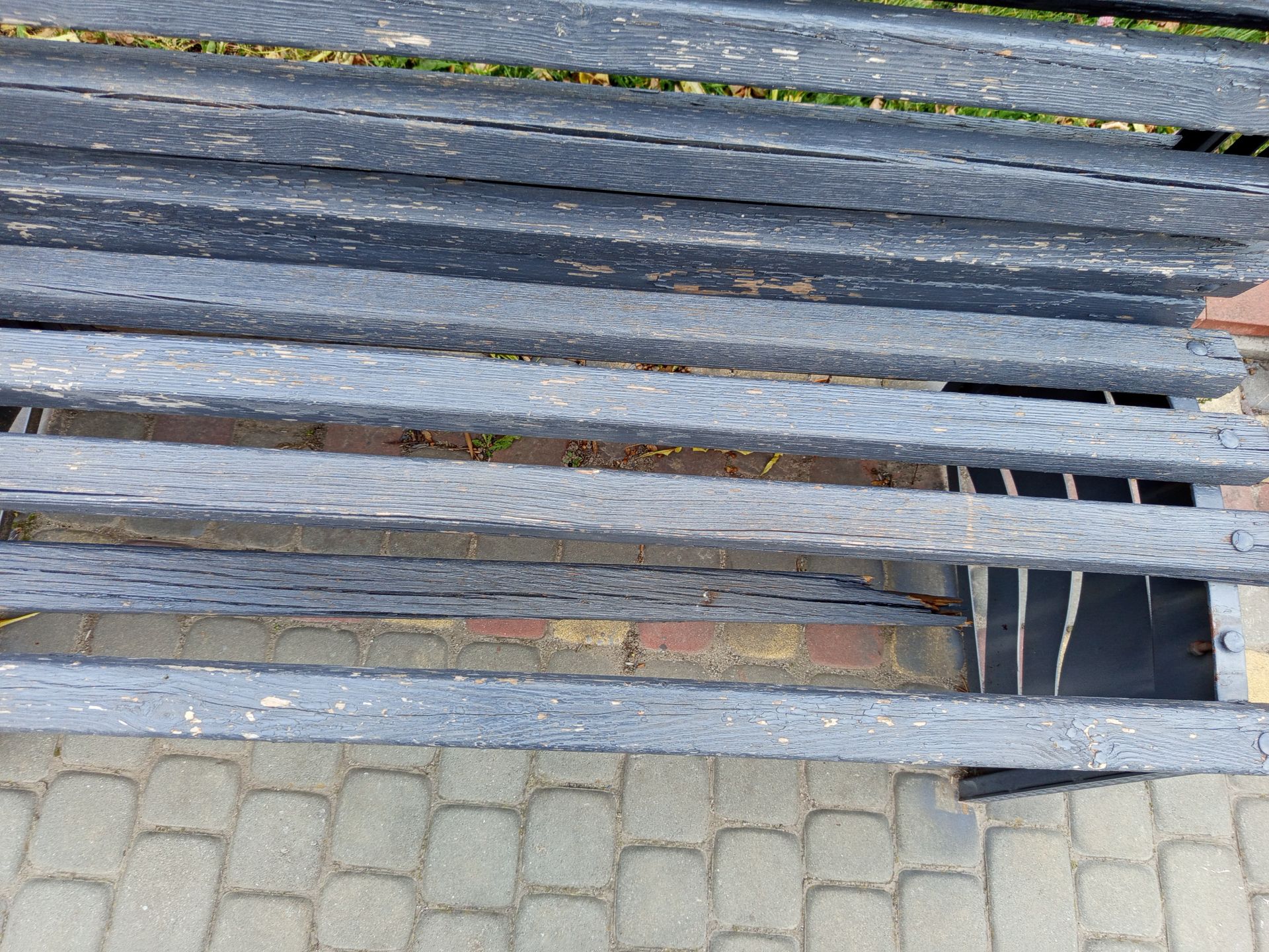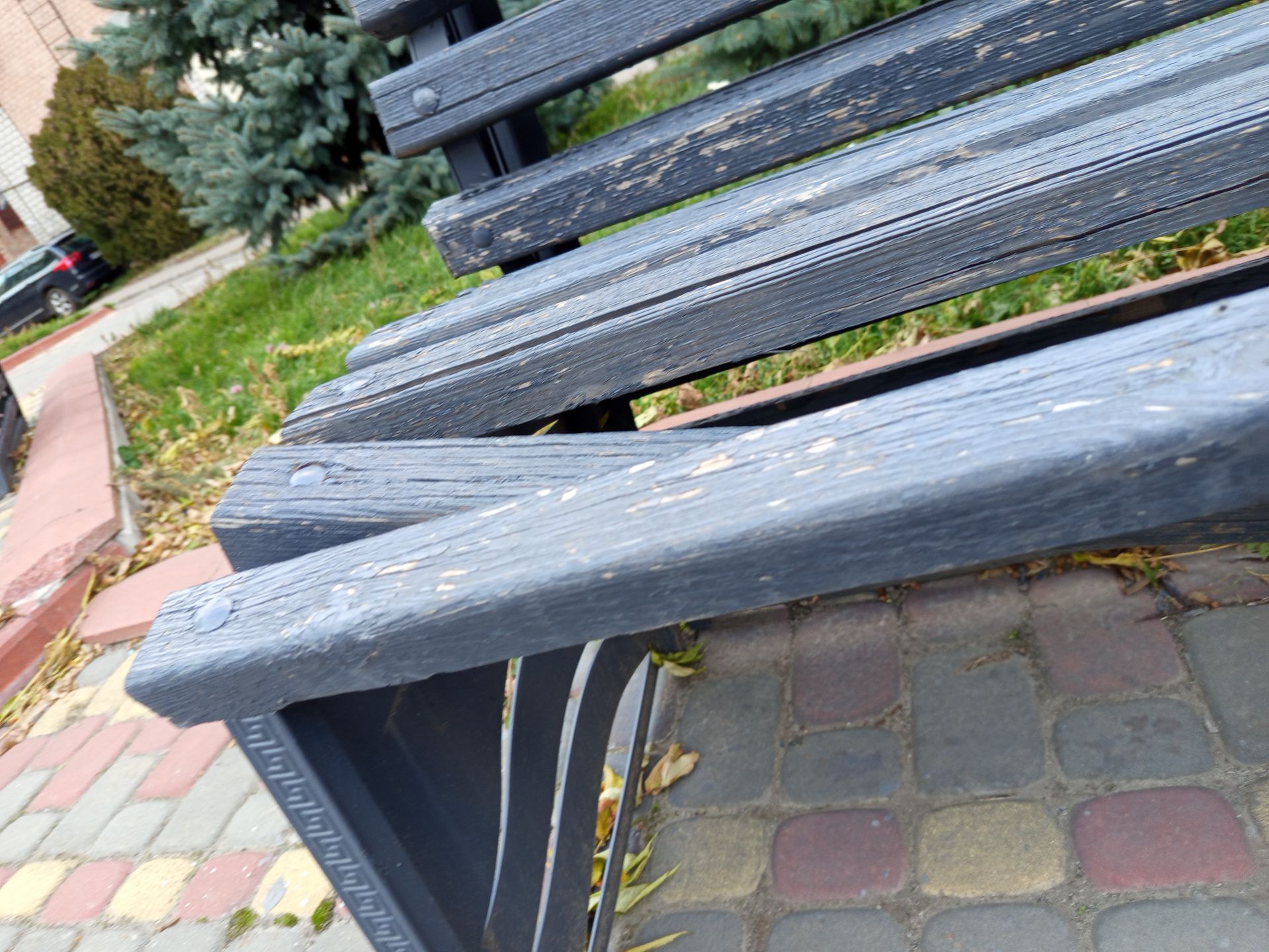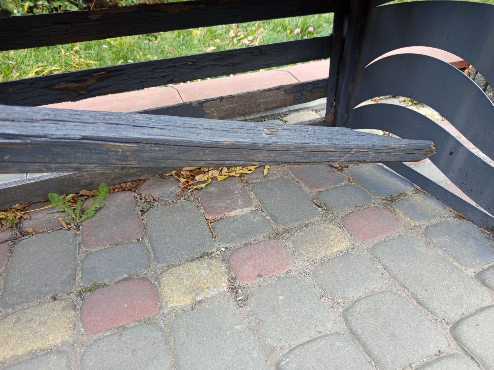 Дерев’яна планка на одній із лавок похилилася додолу. Невідомо, що, чи може хто від’єднав її від кріплення. Та схоже, подібна доля може спіткати й сусідню лавку — там також декілька щаблів пошкодилися біля самісінького кріплення. Щоправда вони ще тримаються.