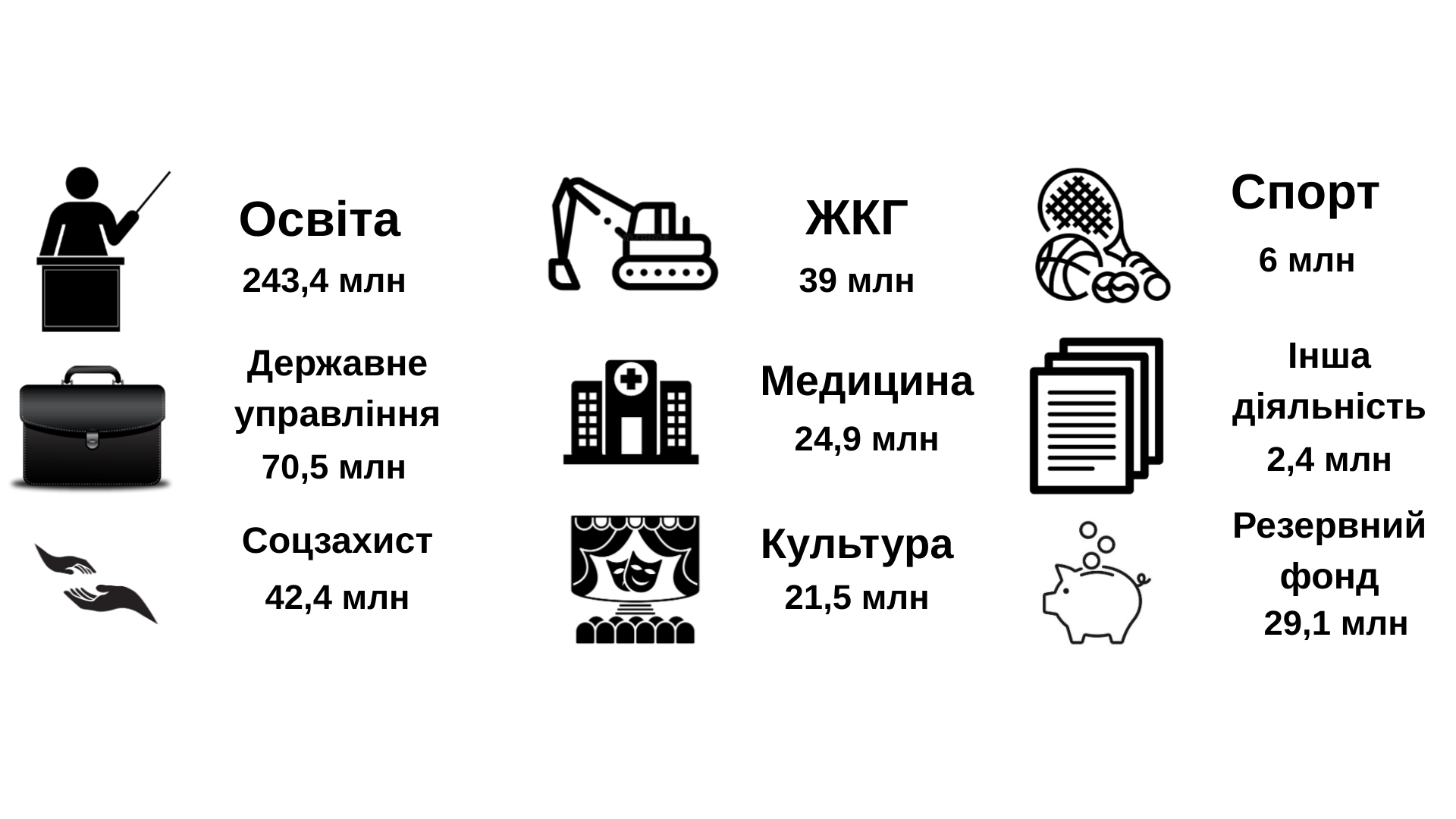 Менше 5% від загального обсягу скарбниці можуть виділити на культуру, а на спорт — шість мільйонів гривень. Також планують закласти до бюджету майже 30 мільйонів гривень резервного фонду на непередбачувані видатки.