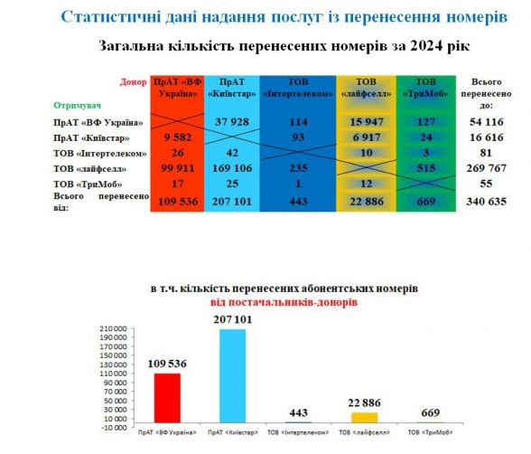 Як свідчать статистичні дані комісії, за 2024 рік 207,1 тисячі номерів було перенесено від Київстару. Водночас перейшли в Київстар від інших операторів усього 16,6 тисяч абонентів.