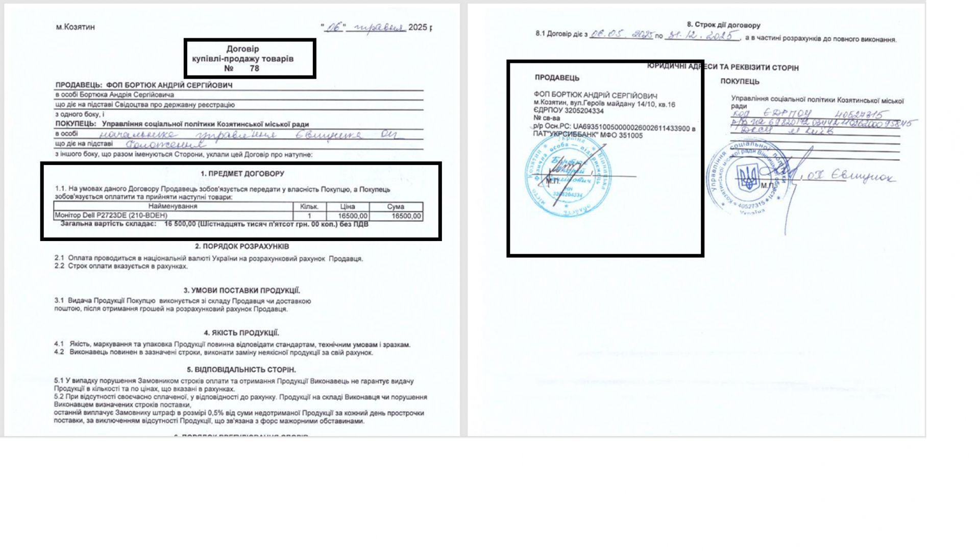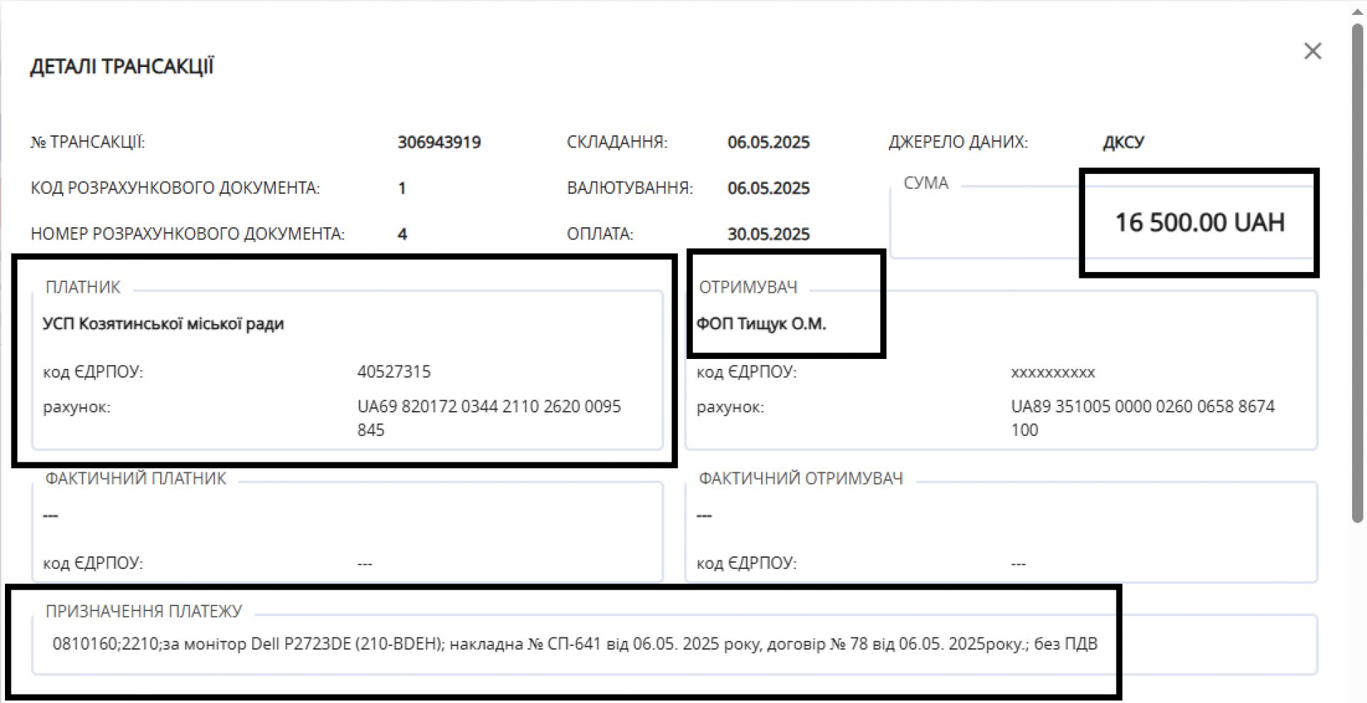 Натомість найменше договорів підписало управління соціальної політики — шістнадцять. У травні цей підрозділ міської ради придбав монітор за 16,5 тисяч гривень. Що цікаво, договір за документами уклали із одним підприємцем, а розрахувалися за товар з іншим, про що свідчить інформація з транзакції.