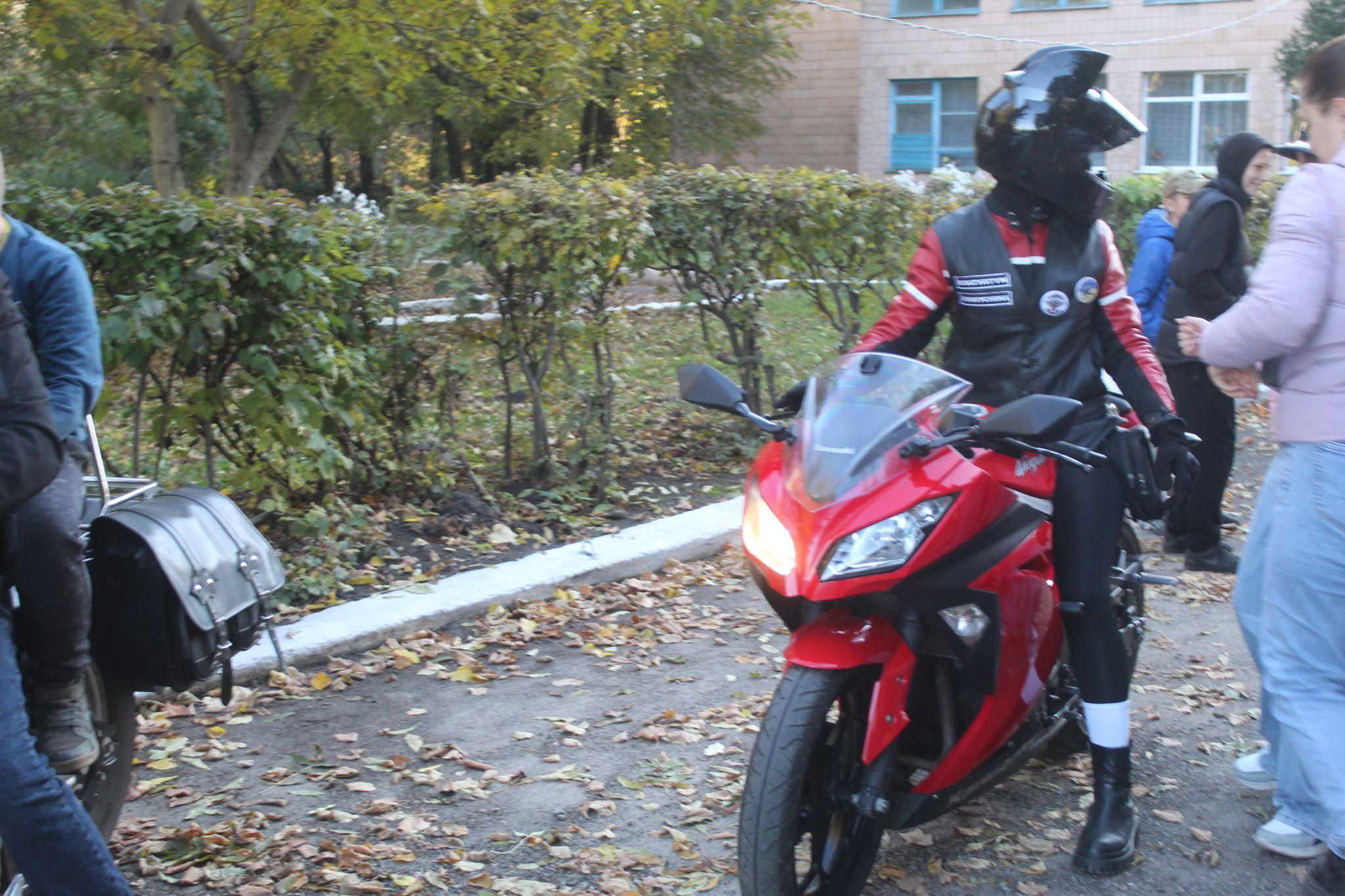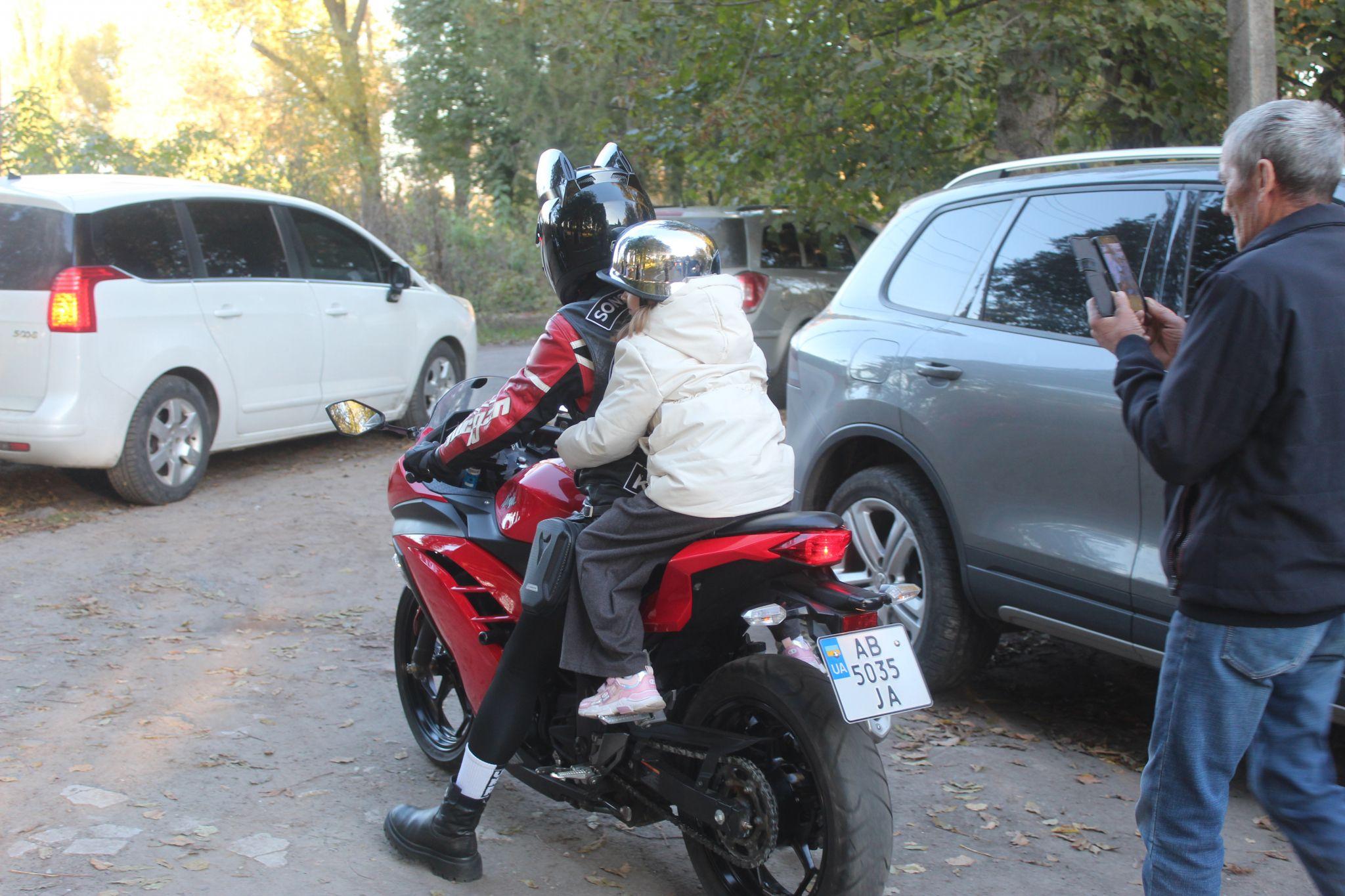 — Так, у нашій групі є дружина загиблого воїна Максима Лінника Ольга Лінник. Вона продовжує справу свого чоловіка. Діти її дуже люблять і називають мото кицею. До неї завжди стоїть черга дітей. Он вона йде до свого мотоцикла,— каже пан Анатолій і ми переключилися на пані Ольгу та запитали у неї де її техніка, що так приваблює дітей.