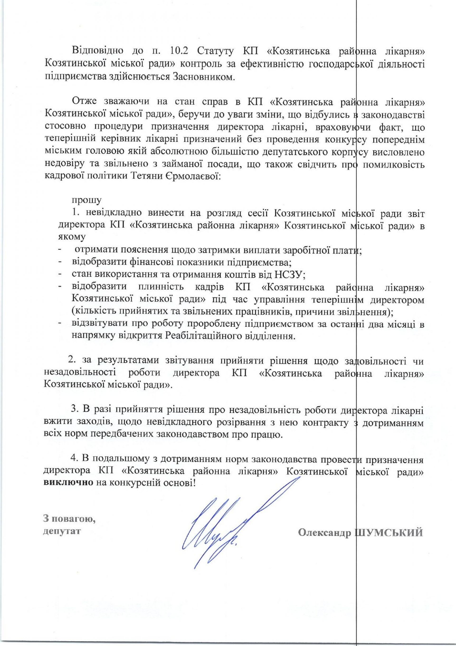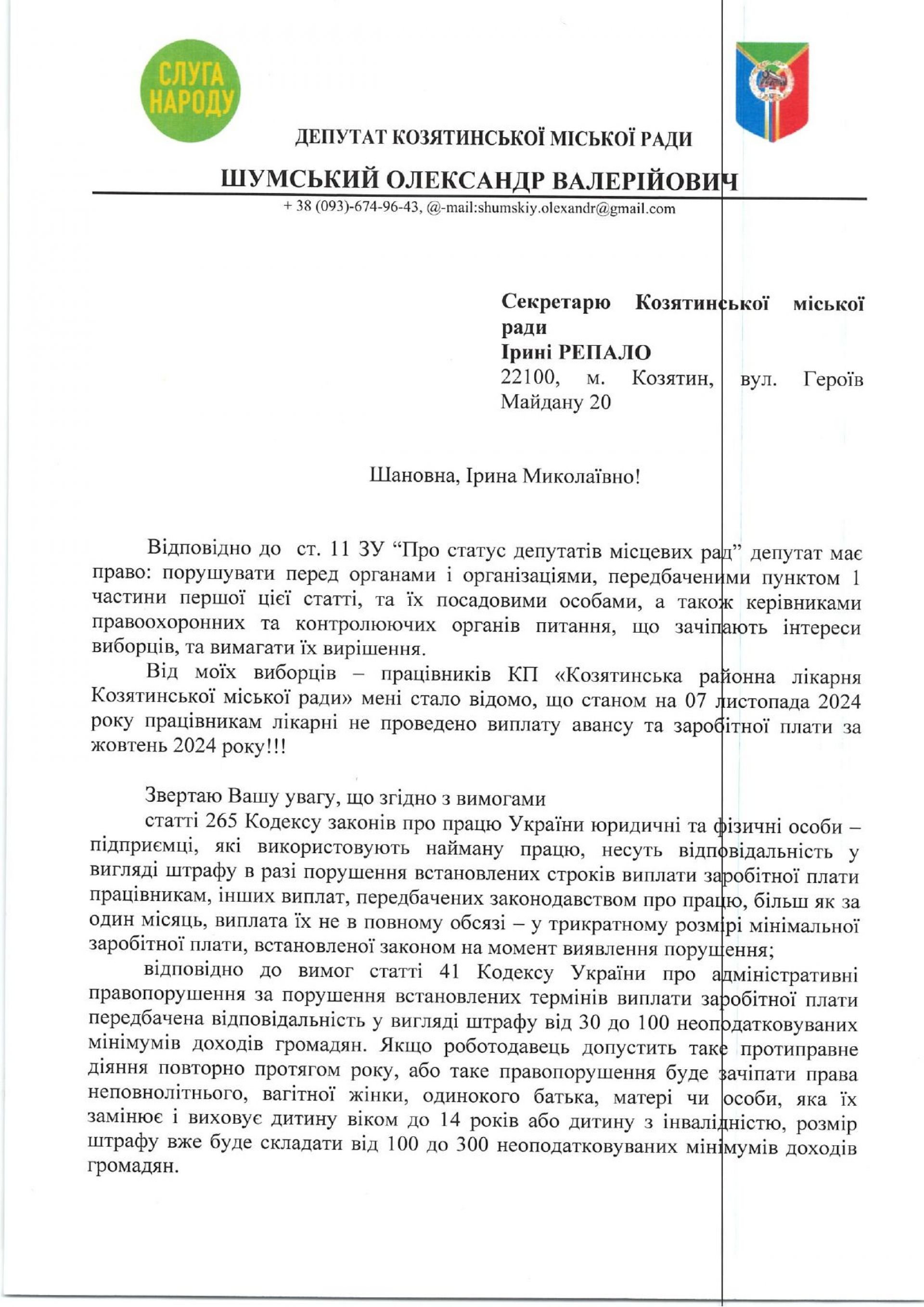 - Депутат Козятинської міської ради Олександр Шумський опублікував допис, де написав про затримку виплат заробітної плати за жовтень працівникам Козятинської ЦРЛ.
