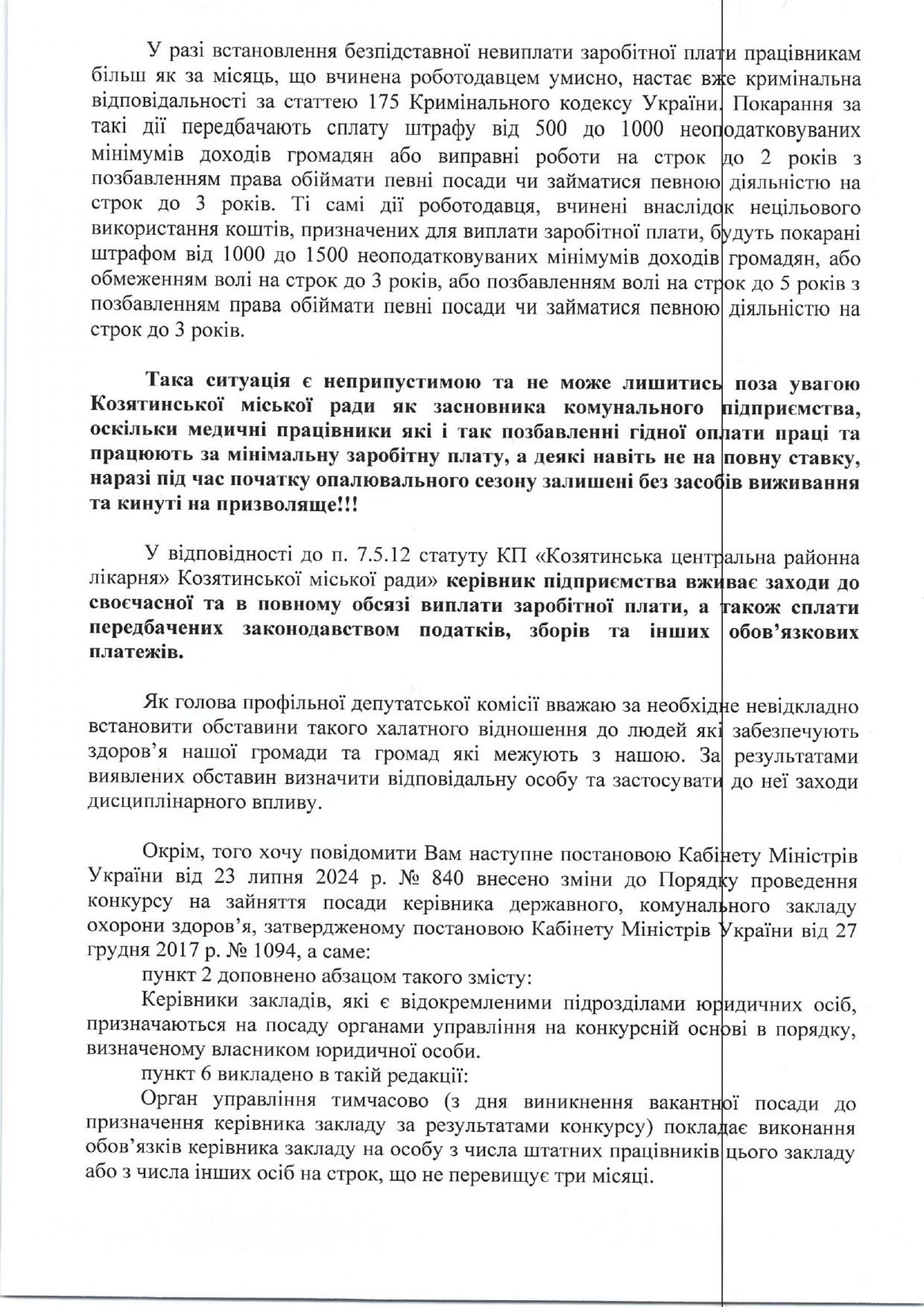 «Склалась ситуація, яка потребує розголосу. Медичні працівники нашої громади досі не отримали аванс та заробітну плату за жовтень місяць. Тільки вдумайтесь, люди які працюють майже за мінімалку, а деякі навіть не на повну ставку, наразі з настанням холодів позбавлені можливості на нормальне існування. В зв'язку з чим звернувся до керівництва міста для встановлення та покарання винних в даній халатності. Керівництво лікарні зобов"язане невідкладно виправити ситуацію».