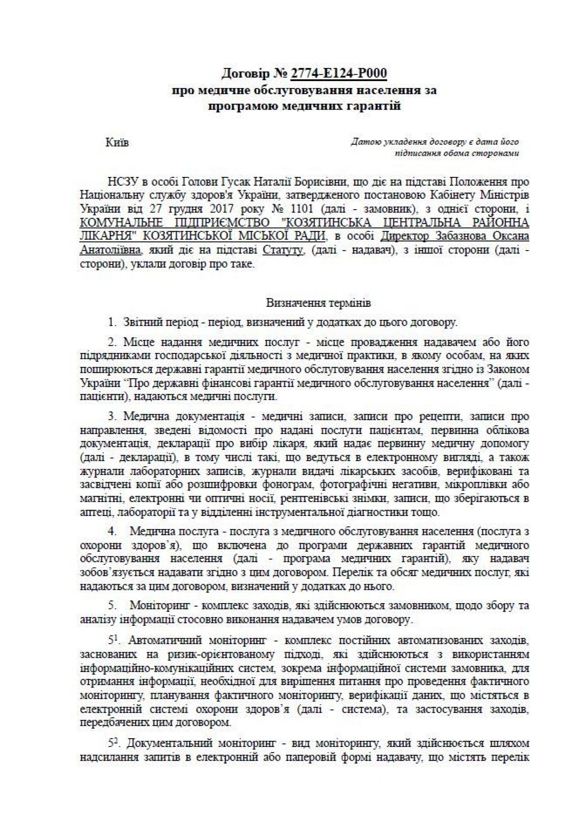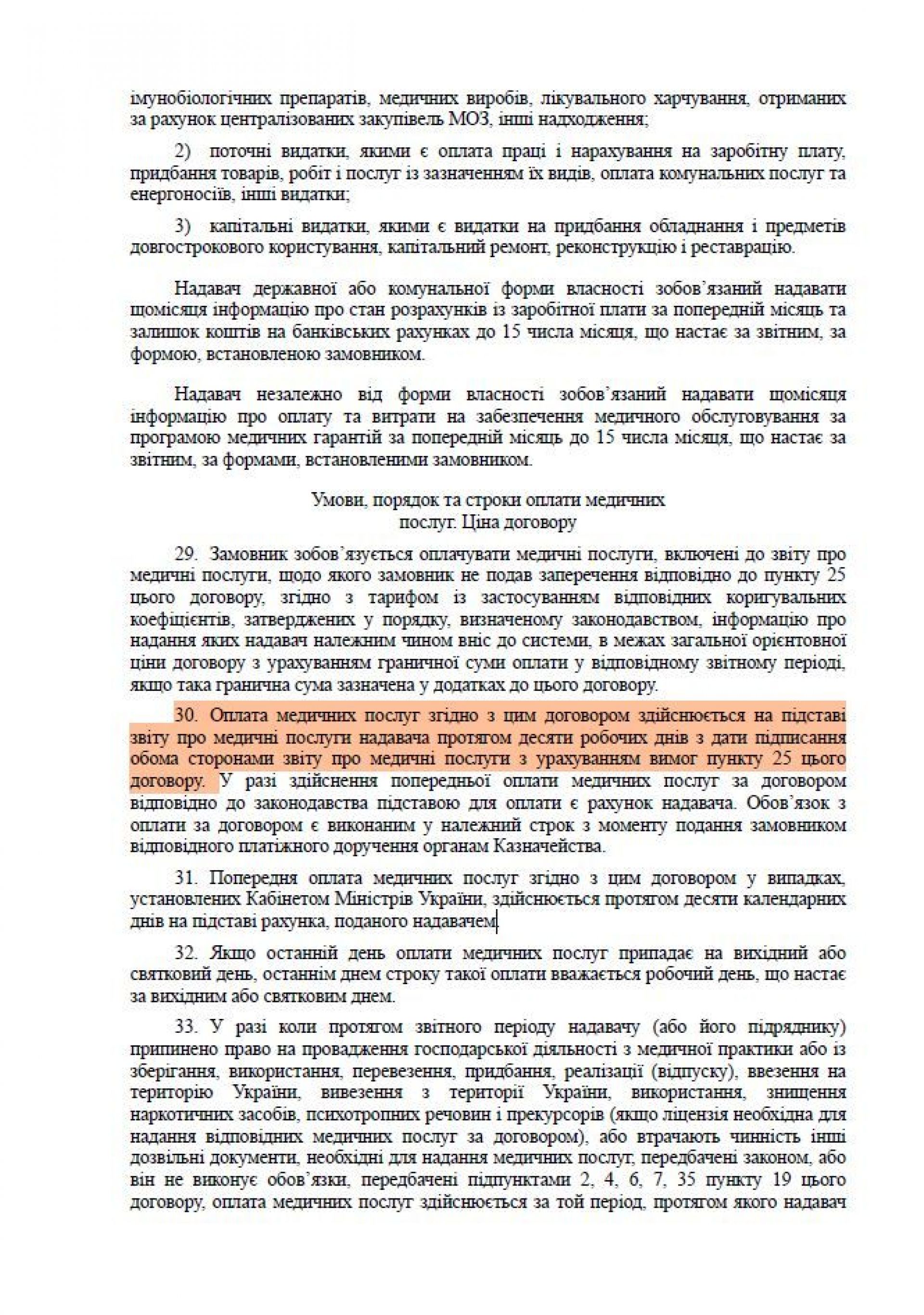 Тож, згідно Договору про медичне обслуговування за програмою медичних гарантій, який був підписаний керівництвом Козятинської ЦРЛ із НСЗУ у лютому 2024 року, цитують: «Оплата медичних послуг здійснюється на підставі звіту про медичні послуги надавача протягом 10 робочих днів з даит підписання обома сторонами звіту про медичні послуги»