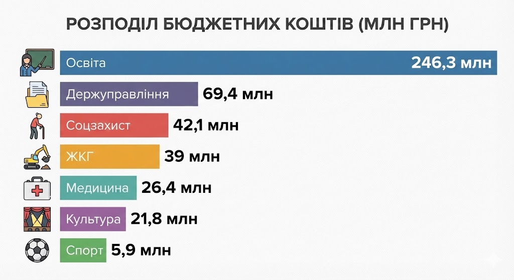 Тепер перейдімо до розподілу за статтями витрат. Найменше коштів передбачили для спорту — трохи більше 1% від загального обсягу скарбниці. Зокрема, на утримання дитячо-юнацької спортивної школи планують спрямувати 3,7 мільйона гривень, на розвиток і підтримку доступної спортивної інфраструктури — два мільйона.