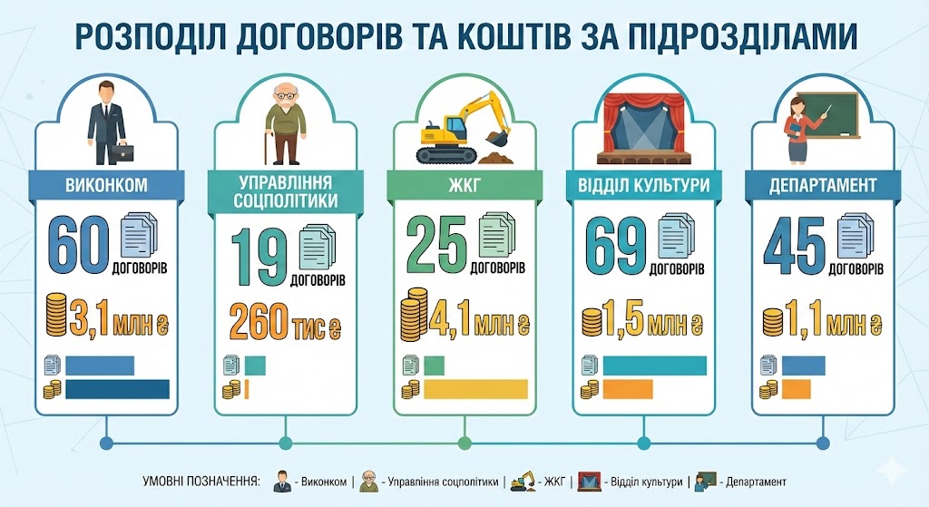 Найменше угод у грудні традиційно уклало управління соціальної політики. Замовляли виготовлення та встановлення флагштоків, пальне, техобслуговування і ремонт офісної техніки, оргтехніку, послуги з поховання загиблих Героїв, організацію заходу «Батьківське серце», квіти та повірку сигналізатора газу.